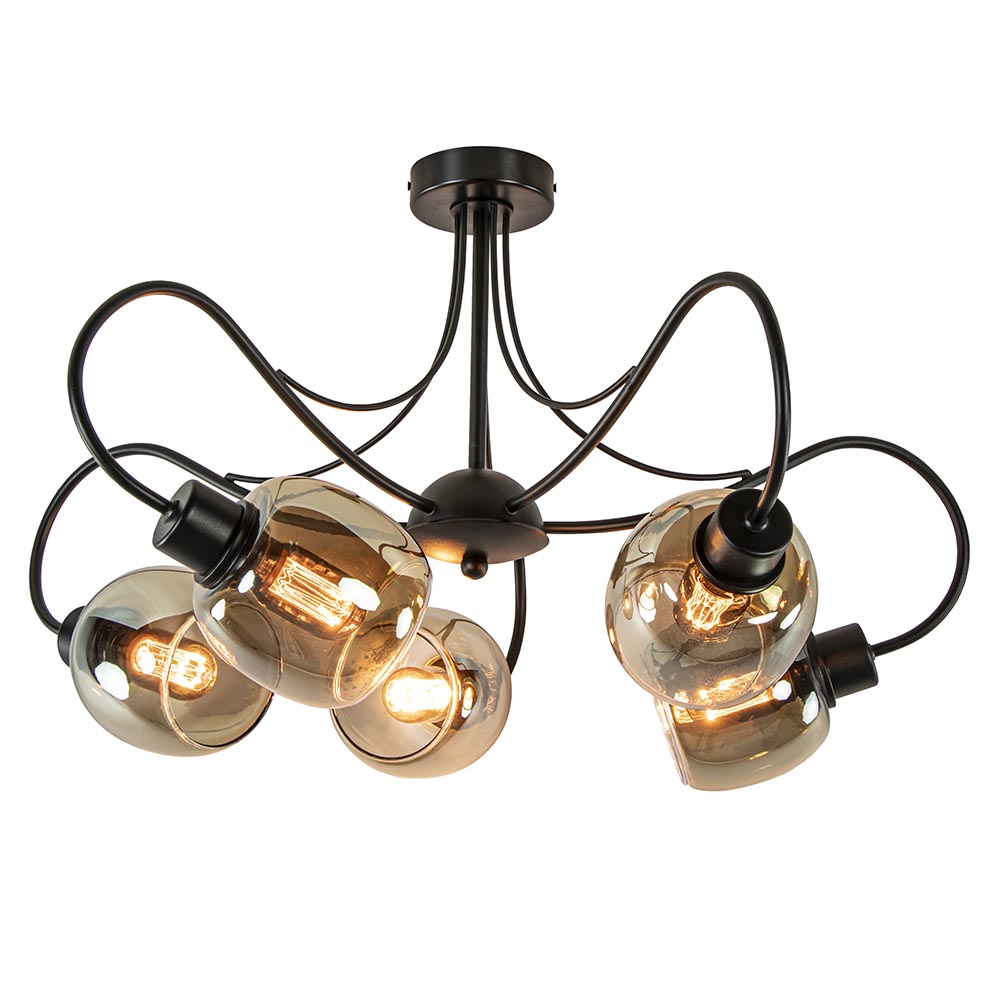 Een stijlvolle plafondlamp met een sierlijk design. De plafondlamp heeft een metalen armatuur dat is uitgevoerd in het mat zwart. De sierlijke armen geven de lamp een klassieke uitstraling. Het zwarte armatuur is mooi gecombineerd met smoke glas wat de lamp weer een trendy en chique look geeft. De plafondlamp heeft een flinke afmeting en past dan ook mooi in een woonkamer of slaapkamer. De 5-lichts plafondamp met smoke glas wordt geleverd exclusief lichtbronnen en is dimbaar middels een externe dimmer (exclusief).