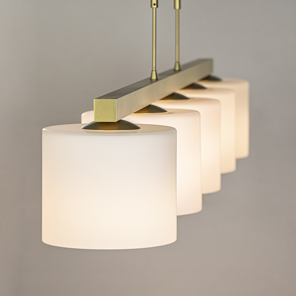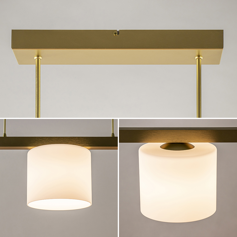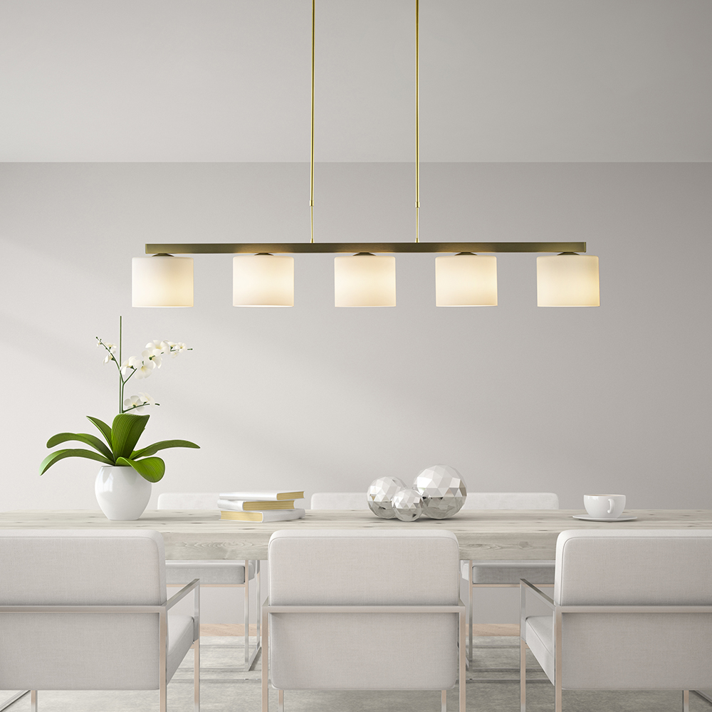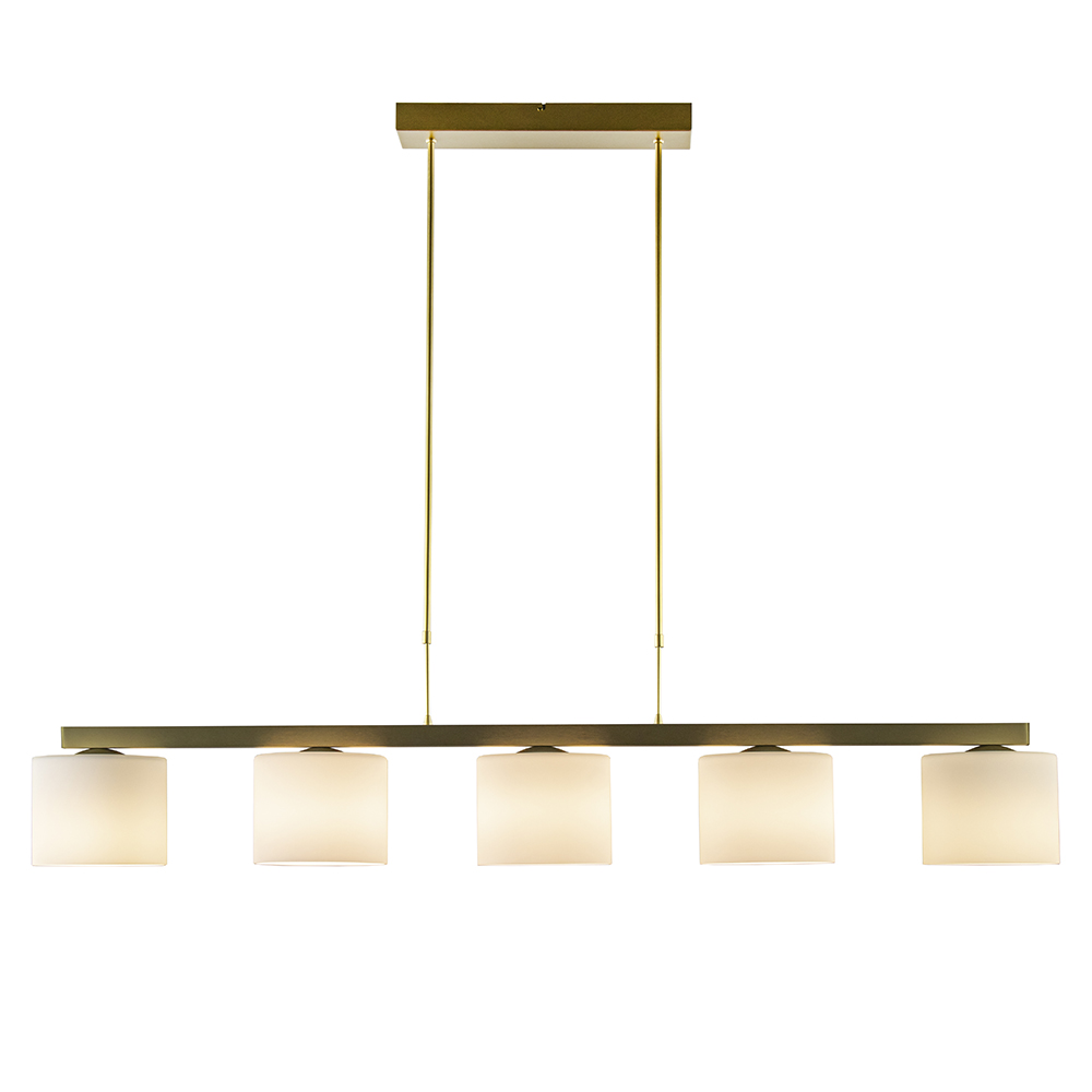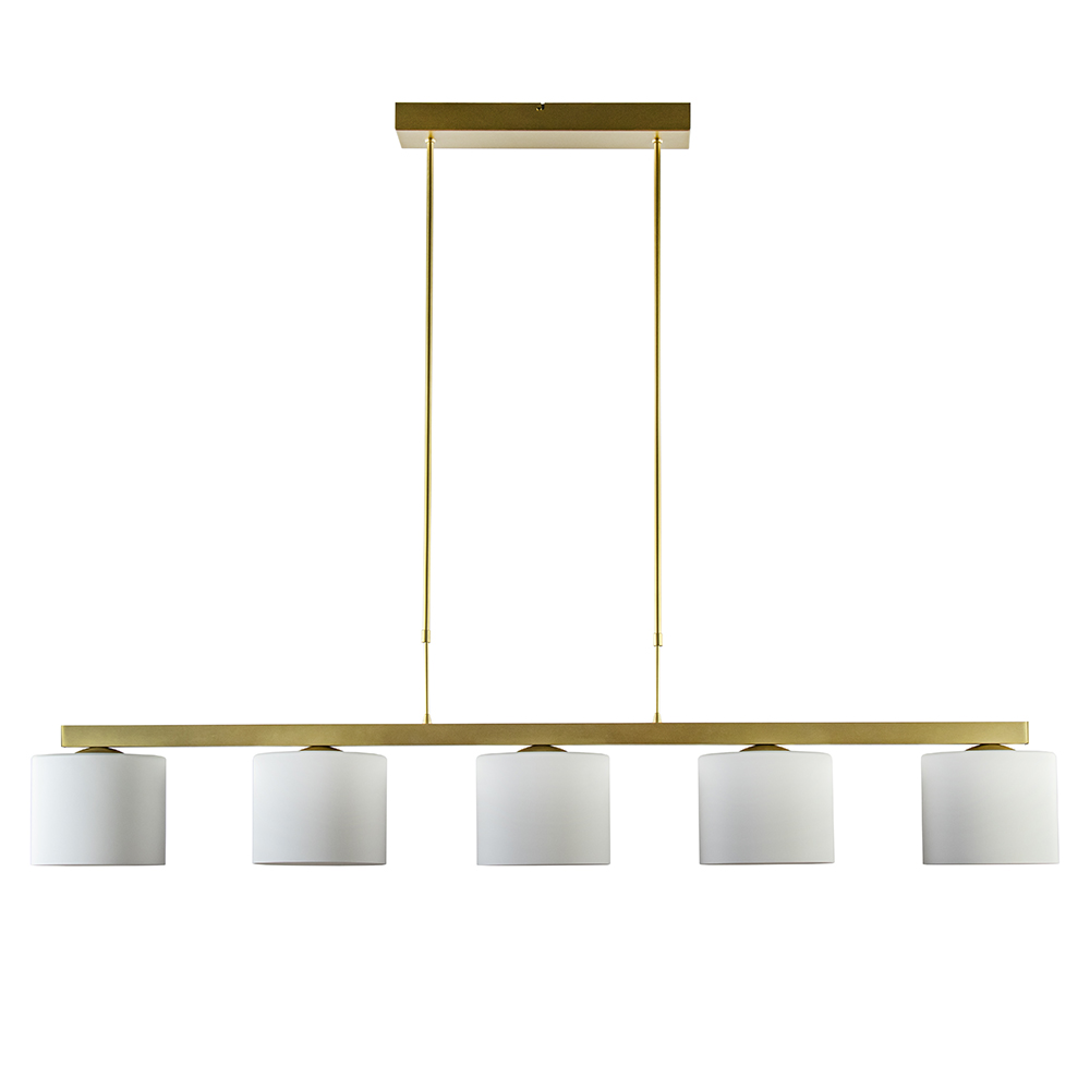 Deze strak klassieke hanglamp is een chique toevoeging aan het interieur. De hanglamp heeft een metalen armatuur dat is uitgevoerd in het mat goud en is mooi gecombineerd met mat witte glazen kappen. Het armatuur is in hoogte te verstellen met een maximale hoogte van 160 cm. De mat gouden hanglamp met wit glas is dimbaar middels een externe dimmer en wordt geleverd exclusief lichtbronnen. De hanglamp is een mooie toevoeging boven een eettafel of kookeiland.