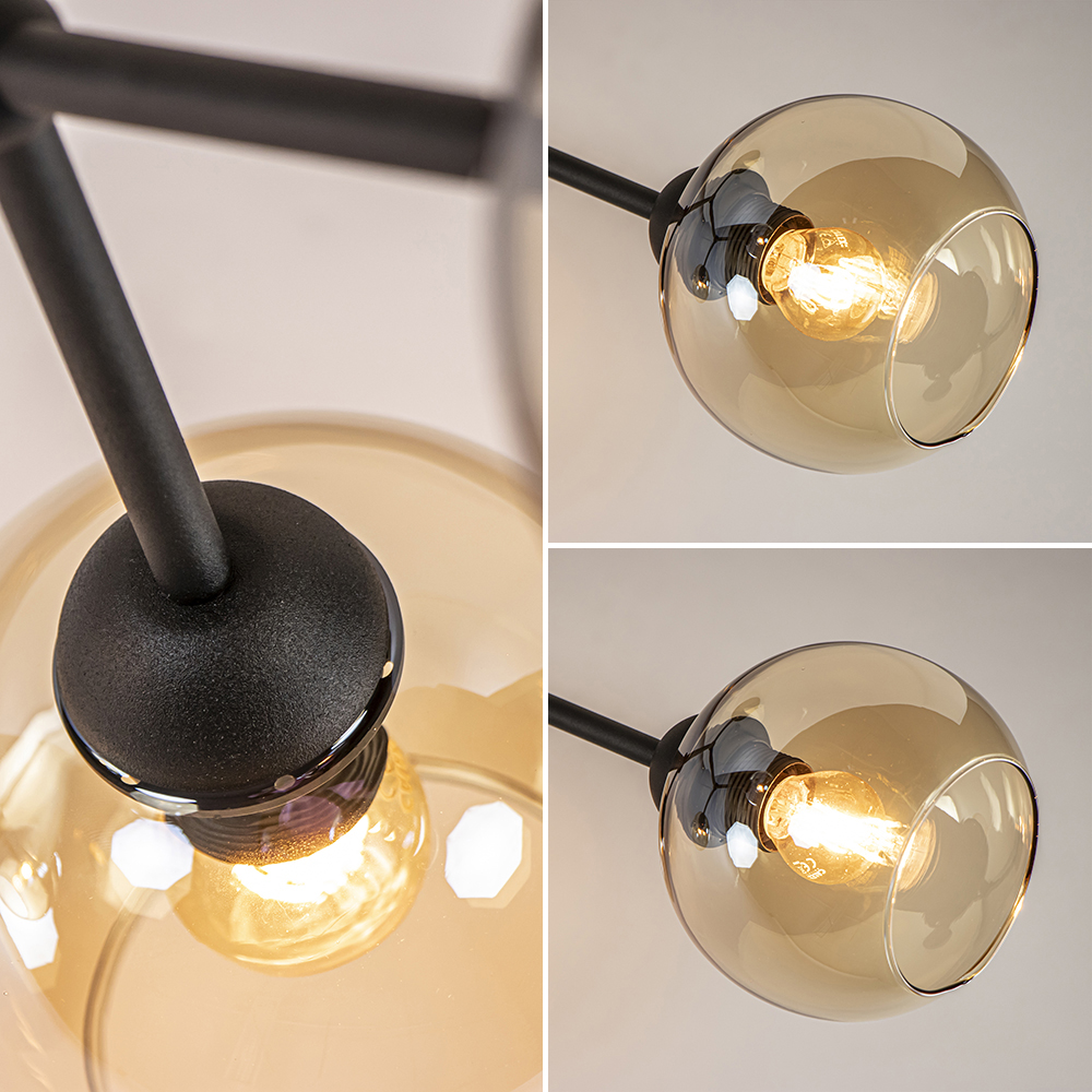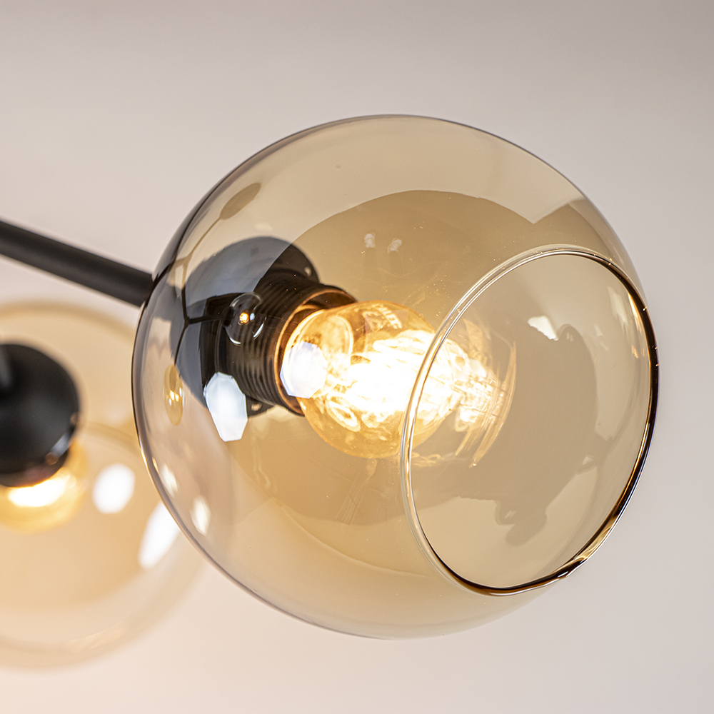 Een hele leuke plafondlamp die echt gezien mag worden, deze verveelt nooit. Door zijn verschillende armen is hij speels en heel decoratief. Het armatuur is van metaal en mat zwart gespoten. De gouden/amber glazen geven de plafondlamp een luxe uitstraling en helemaal van deze tijd. Uitermate geschikt voor in een hal, keuken, woonkamer of slaapkamer. Ook leverbaar met smoke glazen