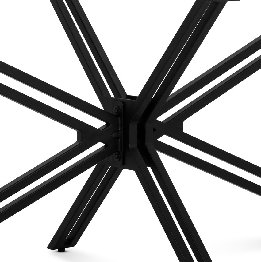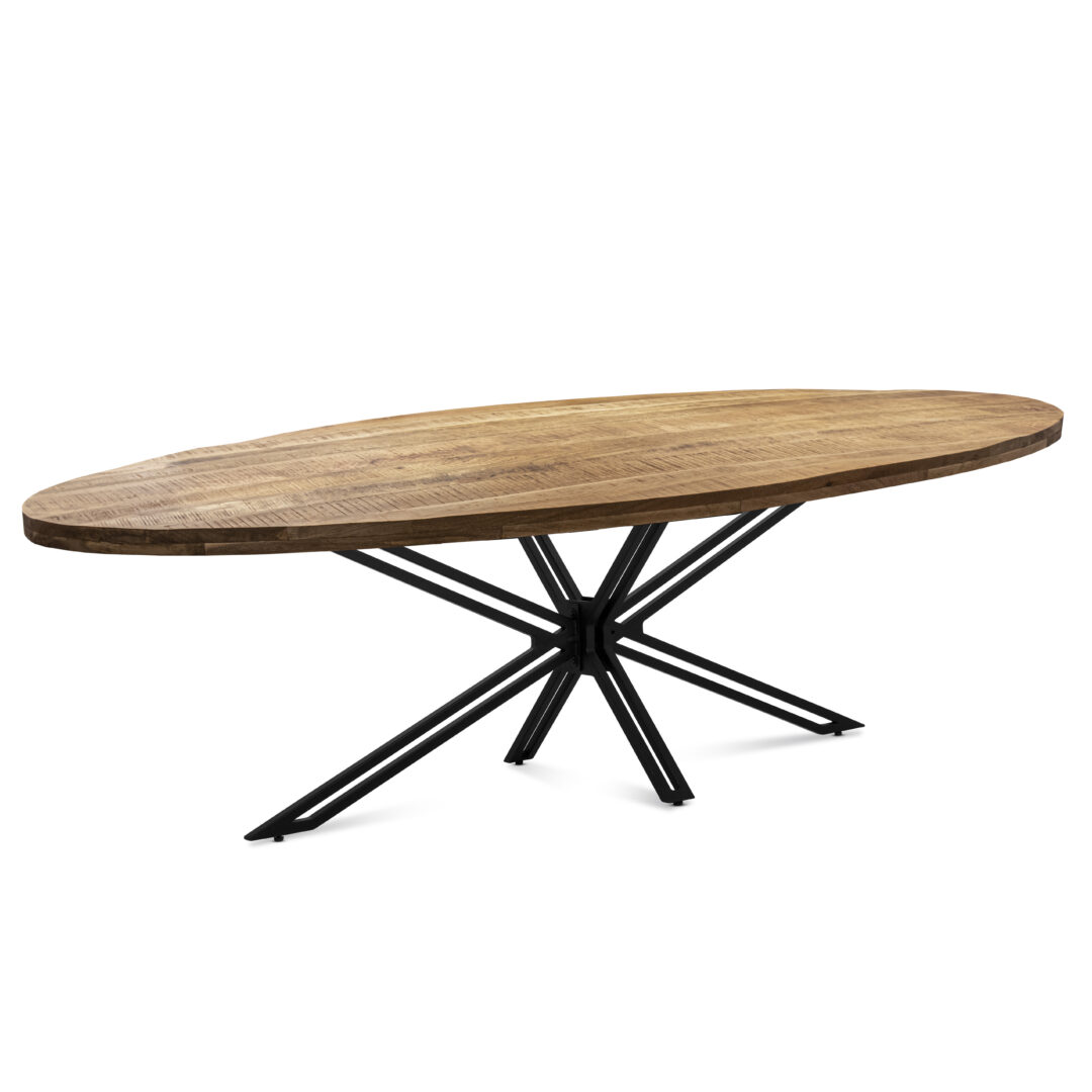 Deze prachtige eettafel bestaande uit een stevig tafelblad van mangohout en een spinpoot van metaal die samen zorgen voor een prachtig samenspel waardoor de tafel een waar kunstwerk wordt om naar te kijken. Het elegante ontwerp combineert strakke lijnen met een subtiele diagonale accenten. De organische vorm zorgt voor een harmonieuze uitstraling en creëert een gezellige sfeer in de woonkamer terwijl de zwarte gepoedercoate spinpoot de tafel een trendy en industriële touch geeft.