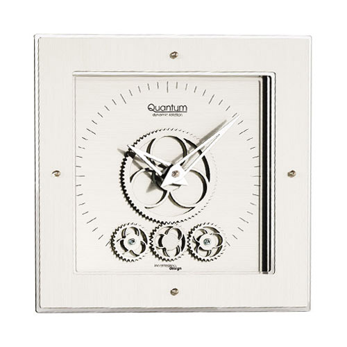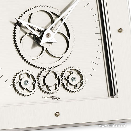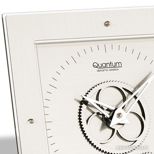 Deze moderne tafelklok heeft een origineel ontwerp. De eenvoudige basis is vierkant, maar de tandwielen draaien. Een genot om de dynamiek van de beweging te observeren. De basis is gemaakt van syntetisch glas, de rest van de klok is gemaakt van metaal. De klok past prachtig in een modern of design interieur en zal ook niet misstaan op kantoor.