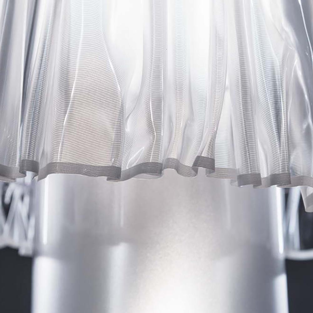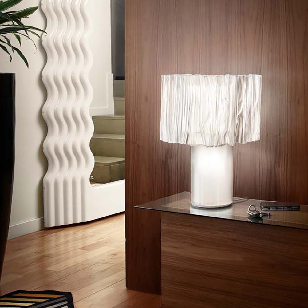 Deze design tafellamp is een prachtige toevoeging aan het interieur. De stijlvolle tafellamp heeft een uniek ontwerp waarbij de kunststof kap is geplooid en zo als het ware een accordeon effect krijgt. Dit wordt met de hand gedaan waardoor iedere lamp uniek is. Wat ook uniek is aan de lamp, is dat zowel de voet als de kap licht geven. Beide zijn voorzien van lichtpunten en kunnen ook apart worden bediend. Zo kunt u alleen de voet, alleen de kap of juist beide aanzetten. Dit werkt gemakkelijk met de schakelaar in het transparante snoer. Deze design tafellamp is een echte musthave voor wie van interieur en Italiaans design houdt.