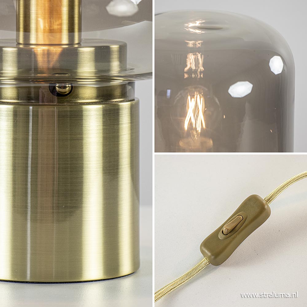 – hoogte: 52 cm – kap: Ø22×33 cm – voet: Ø12×11 cm – smoke glas – metaal, brons – goud snoer: 175 cm, schakelaar op 28 cm – exclusief lichtbron (E27)