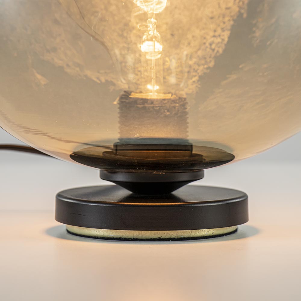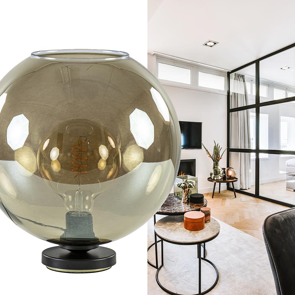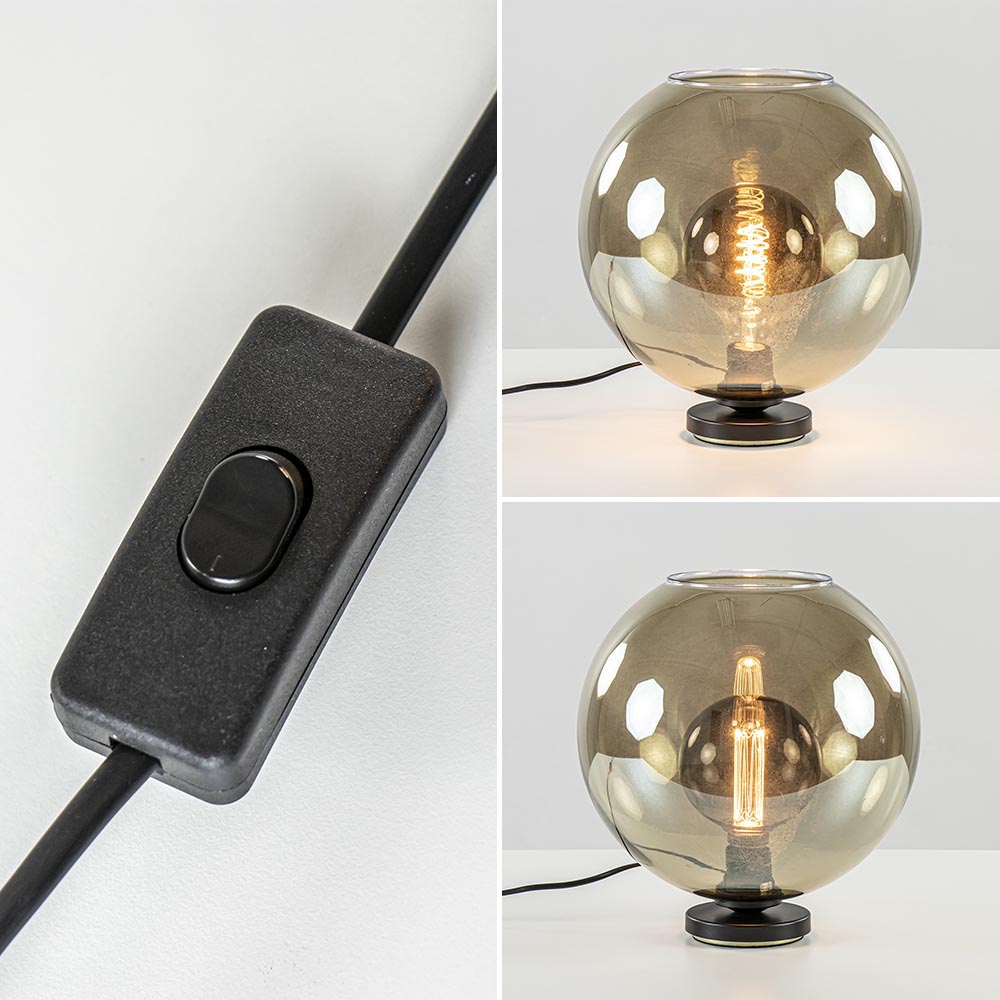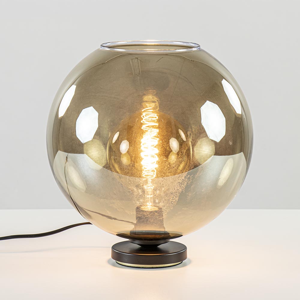 Een sfeervolle tafellamp met een luxe uitstraling. De tafellamp bestaat uit een metalen voet die is uitgevoerd in het mat zwart en een smoke glazen bol met een doorsnede van 30 cm. Het donkere glas geeft een chique luxe uitstraling die mooi is toe te passen in diverse woonstijlen. De tafellamp past perfect op een dressoir, kast of zelfs het nachtkastje. De ronde voet is voorzien van een zwart snoer met een lengte van 180 cm, de knipschakelaar zit op 65 cm in het snoer. De tafellamp smoke glazen bol 30 cm wordt geleverd zonder lichtbron (E27).