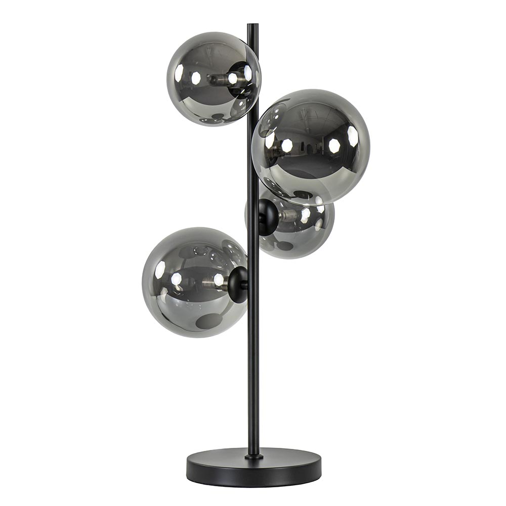 Een chique tafellamp die helemaal past binnen de huidige woontrends, van hotel chic tot art deco. De tafellamp heeft een slank design waardoor de aandacht echt naar het glas gaat. Het smoke glas straalt luxe en glamour uit en is zowel aan als uit een plezier voor het oog. De glazen bollen worden met schroefdraad op het mat zwarte armatuur vastgezet en zijn verdeeld over 2 afmetingen, 15 en 12 cm doorsnede. De tafellamp is voorzien van een dimmer in het snoer, welke een lengte heeft van 185 cm. De chique tafellamp wordt geleverd zonder lichtbronnen.