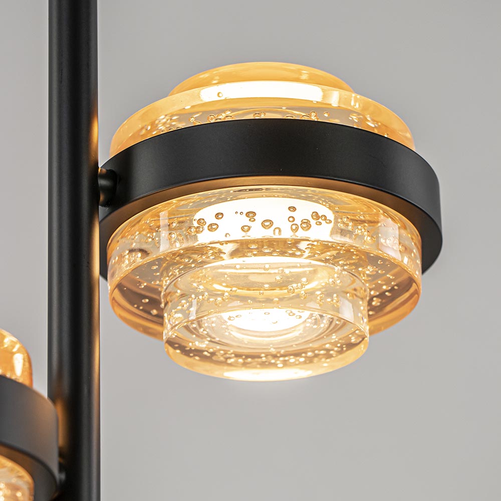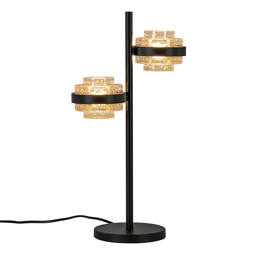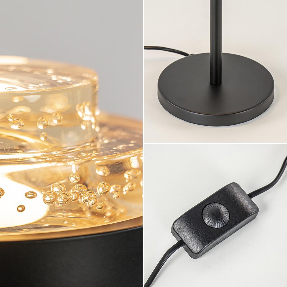 Een sfeervolle tafellamp die mooi past in een klassiek of strak klassiek interieur. De tafellamp is voorzien van twee lichtpunten die zitten verwerkt in het champagne kleurige glas. In het glas zitten ook belletjes verwerkt wat het champagne effect nog extra benadrukt, vooral wanneer de lamp is ingeschakeld. De 2-lichts tafellamp heeft LED verlichting welke middels de dimmer in het snoer kunnen worden gedimt. De mat zwarte tafellamp met champagne kleurig glas heeft een zwart snoer met een lengte van 230 cm. De dimschakelaar zit op 70 cm van de lamp.