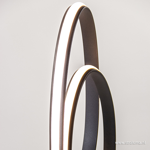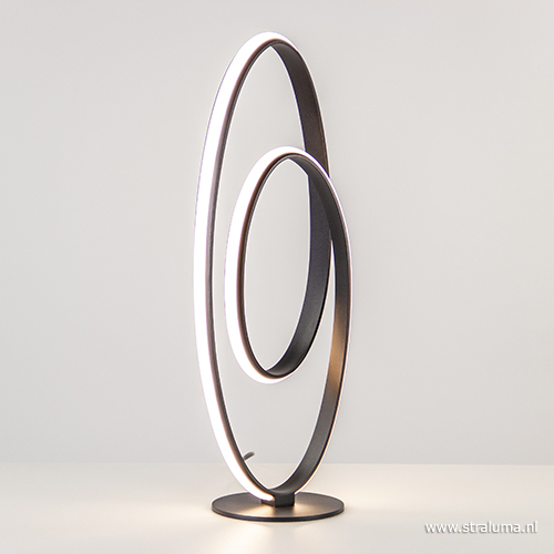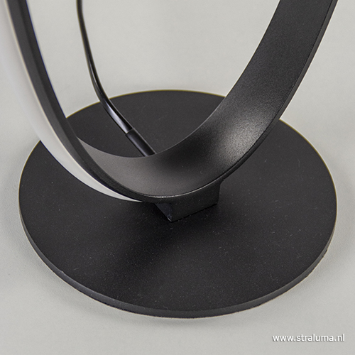 Een moderne ‘design’ tafellamp met elegante lijnen. De LED tafellamp staat op een metalen mat zwarte voet en wordt geleverd inclusief zwart snoer met dimschakelaar. In de kunststof kap zit volledig een LED strip verwerkt. De ronding geeft een speels effect, terwijl de lamp toch een strakke look behoudt. De LED verlichting is met een schuifje op de schakelaar te dimmen en daarnaast is LED ook energiezuinig. Deze tafellamp past mooi in een modern interieur in bijvoorbeeld een woonkamer op het dressoir.