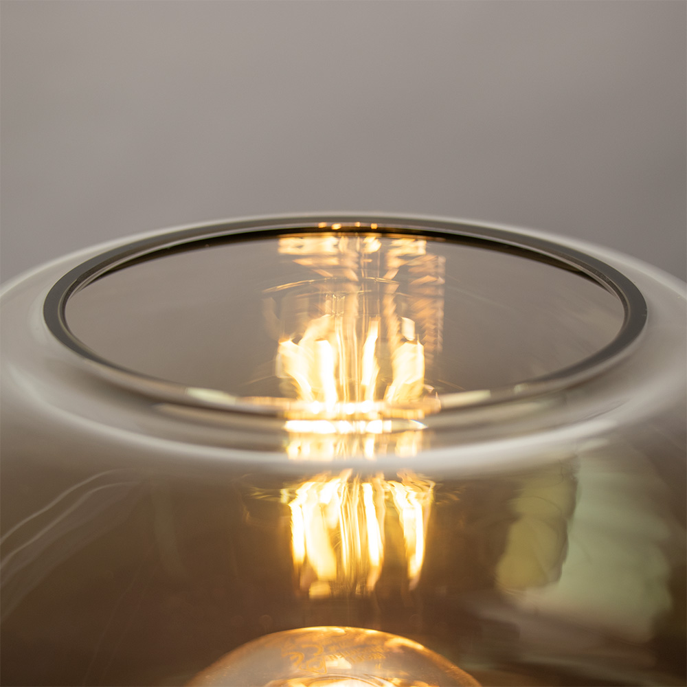 Details: – Afmetingen: ø24x23cm – Voet: ø15×7,5cm – Kap: ø29×18,5cm – Snoer: 180cm | Schakelaar: 65cm – Kleur: Dark Bronze – Materiaal: metaal & glas – Fitting: E27 (excl. lichtbron) – Dimbaar externe dimmer (excl.)