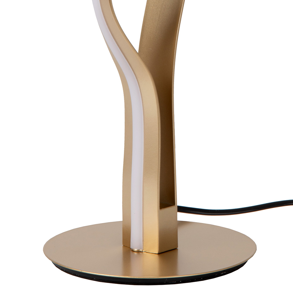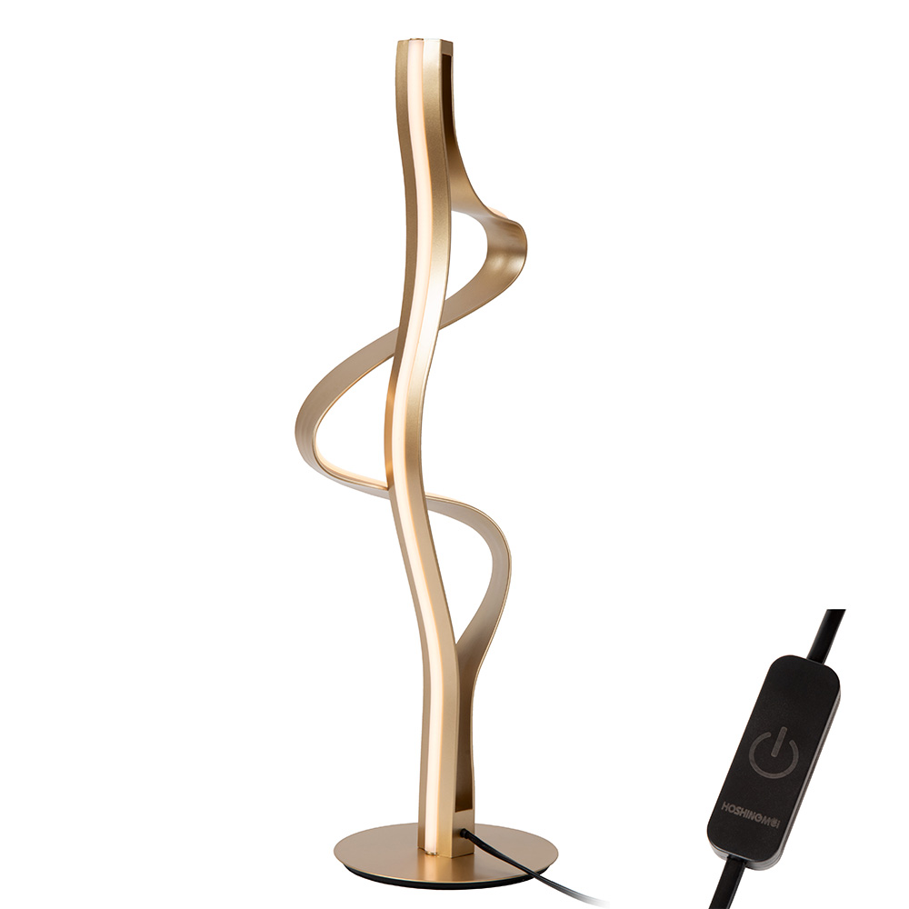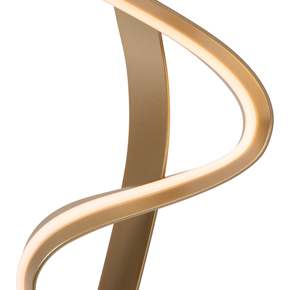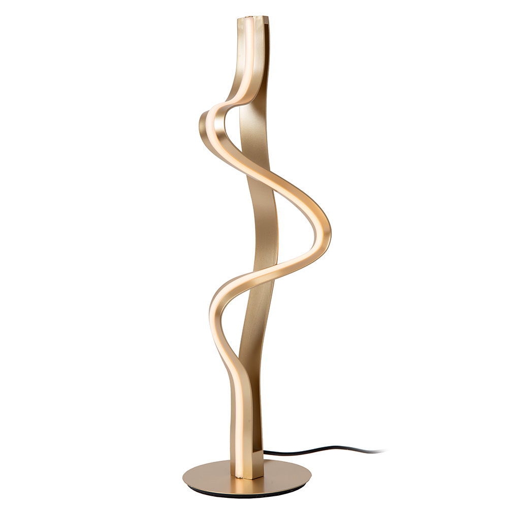 Met haar sierlijke lijnen en sculpturale uitstraling geeft deze moderne tafellamp niet alleen licht, maar voegt zij ook sfeer en elegantie toevoegt aan je interieur. De gebogen vorm lijkt te dansen in de ruimte en creëert een boeiend lijnenspel, zowel bij daglicht als in de avond wanneer de geïntegreerde LED-verlichting tot leven komt. De luxe, matte goudkleurige afwerking geeft de lamp een warme en verfijnde look. Dankzij het slanke ontwerp en de ronde voet neemt de lamp weinig ruimte in, terwijl het effect juist groots is. Ideaal voor een side table, nachtkastje of dressoir.