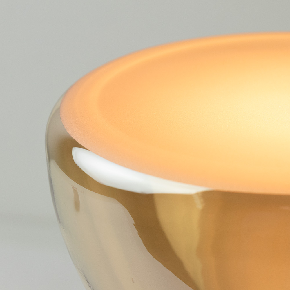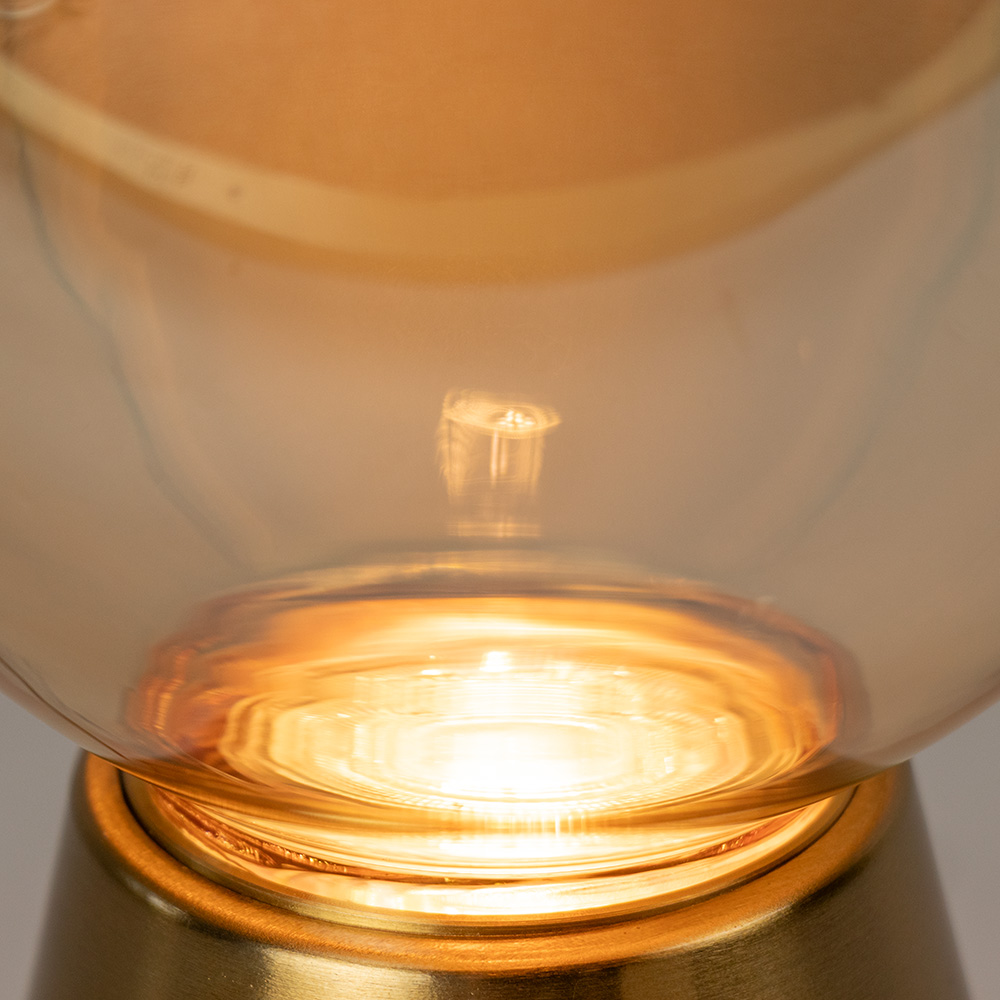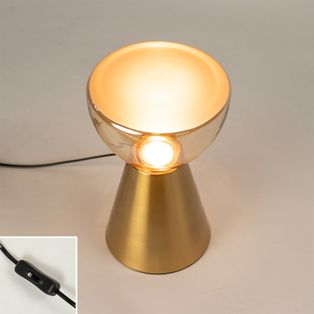 Breng sfeer en elegantie in je interieur met deze prachtige tafellamp. Deze stijlvolle lamp combineert een moderne, goudkleurige metalen voet met een unieke glazen kap in een warme ambertint. Het licht wordt zacht verspreid via de matte binnenzijde van de kap, wat zorgt voor een gezellige gloed – perfect voor op een bureau, dressoir of nachtkastje. De conische voet en de bolvormige kap geven deze lamp een eigentijdse en toch tijdloze uitstraling. Door het compacte formaat pastde tafellamp moeiteloos in elke ruimte. Dankzij het transparante glas en de warme afwerking is het een echte eyecatcher, zelfs wanneer de lamp uitstaat.