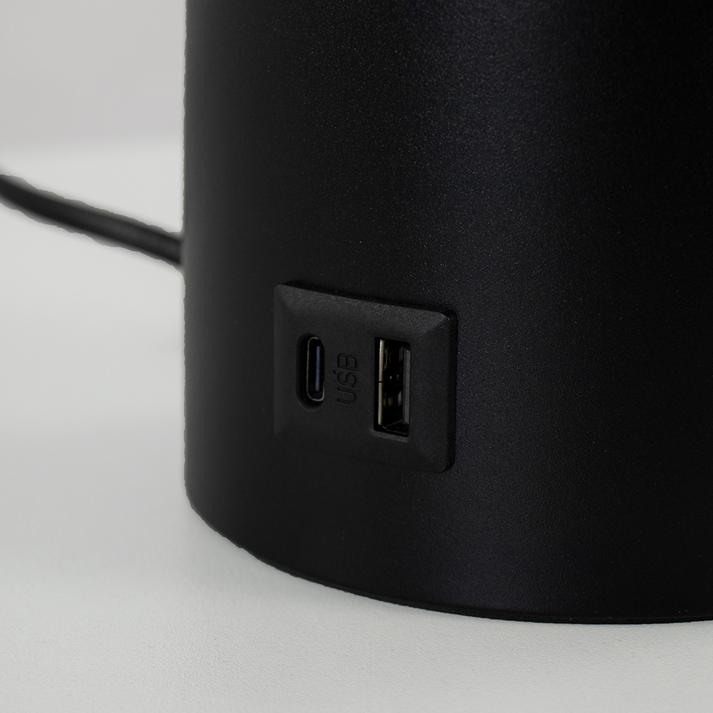 Deze functionele tafellamp met maar liefst 3 oplaadpunten is de ideale toevoeging aan uw kantoor of woonkamer. Het strake design wordt versterkt door de mat zwarte kleur, wat hem perfect maakt voor een moderne sfeer. Boven op de kap zit een wireless charging plaatje waar u de telefoon op kunt leggen om deze op te laden. Ook zitten er op de voet van de lamp een USB-A en een USB-C aansluiting. De tafellamp is voorzien van geïntegreerd LED dat dimbaar is middels de dimmer op de amatuur. Door de knop langere tijd ingedrukt te houden kan de LED lamp harder of zachter worden gezet.