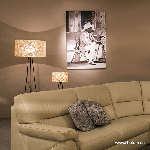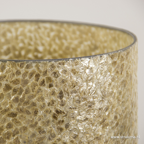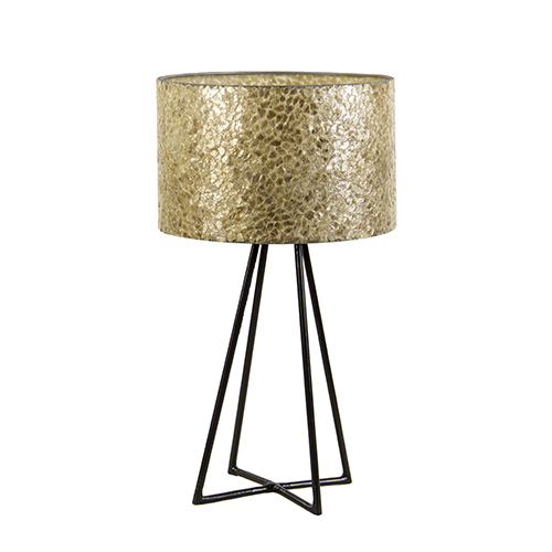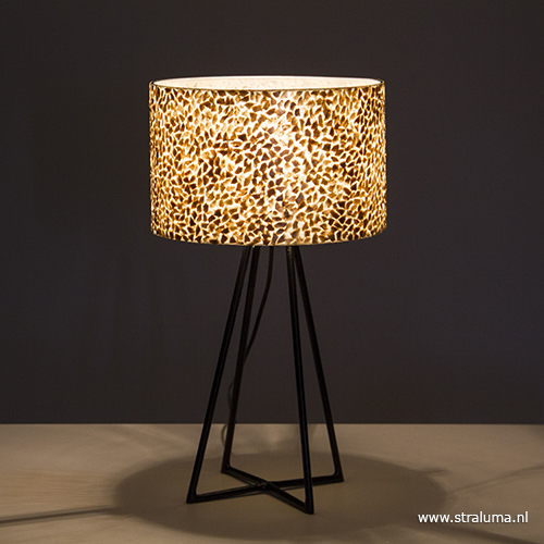 Een leuke moderne lamp met een decoratieve kap. De schelpen kap heeft een gouden kleur wat mooi past bij de zwarte metalen voet. Door de kleur en de schelpen die in de kap verwerkt zitten, geeft de lamp een mooie sfeervolle verlichting. Deze tafellamp is zowel aan als uit een mooie decoratieve toevoeging aan het interieur die zorgt voor een warme gezellige sfeer.