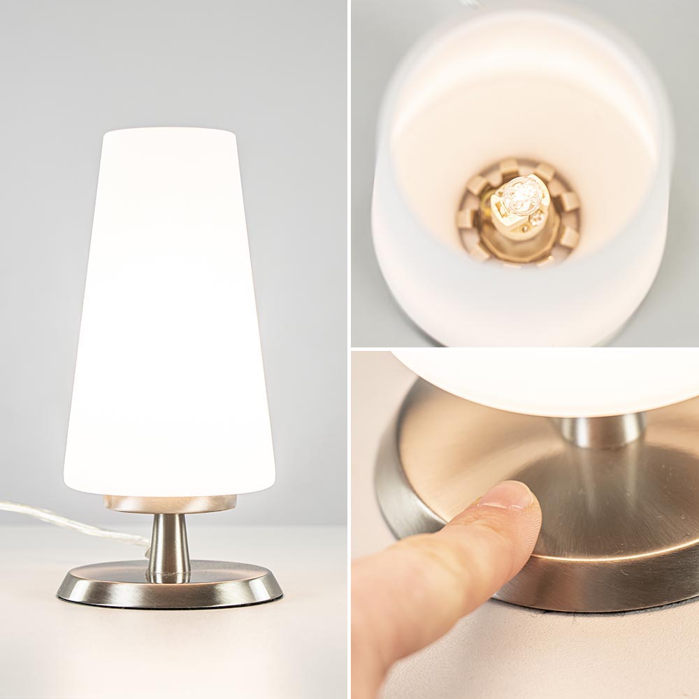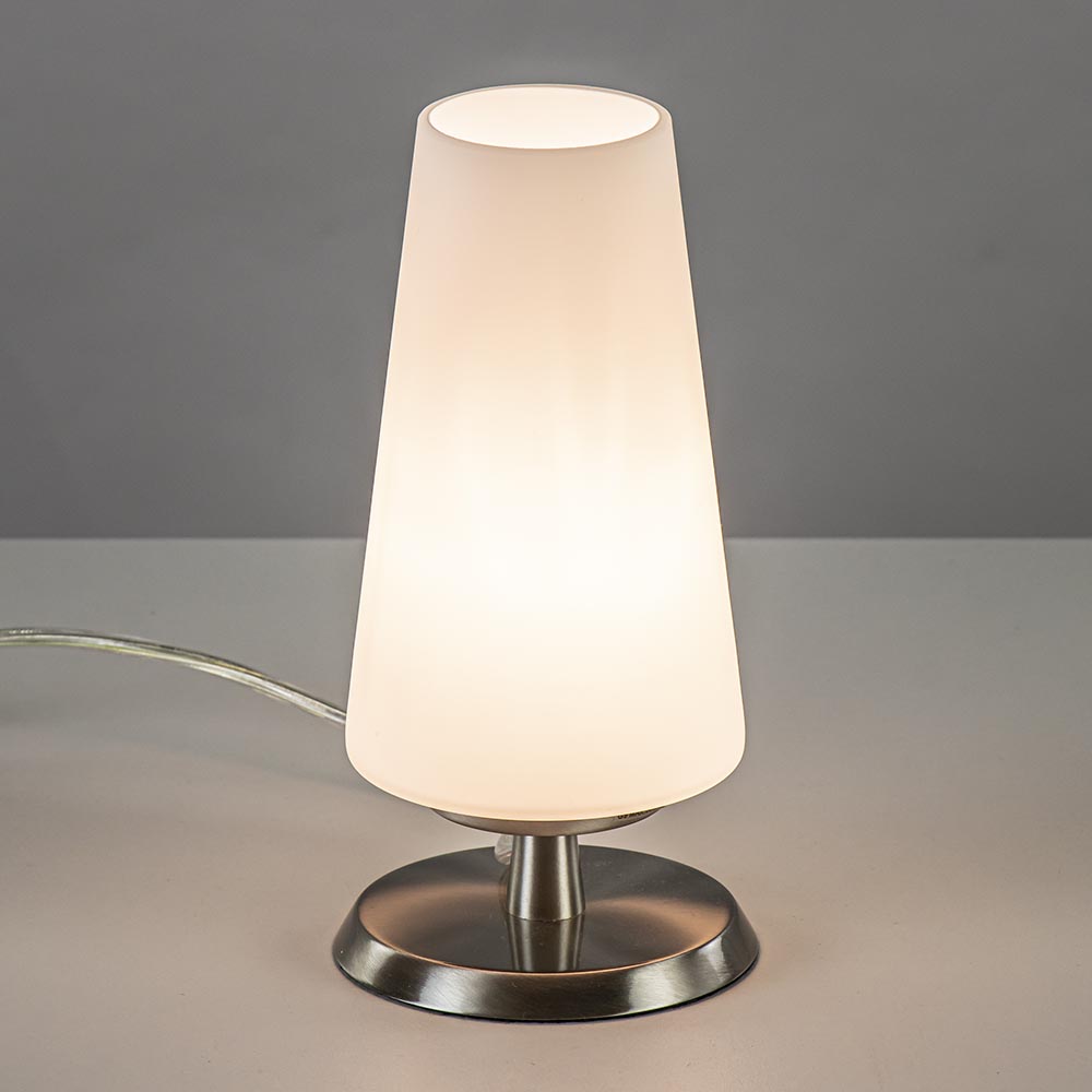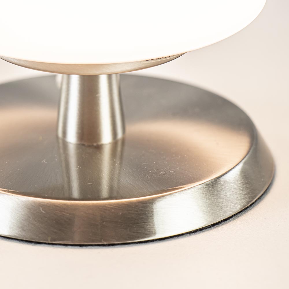 Een heel schattig tafellampje uitgevoerd in nikkel met mat wit glas. De ingebouwde touchdimmer heeft drie standen. Door middel van aanraking kunt u de lichtsterkte bepalen. Echt een sfeerlampje.