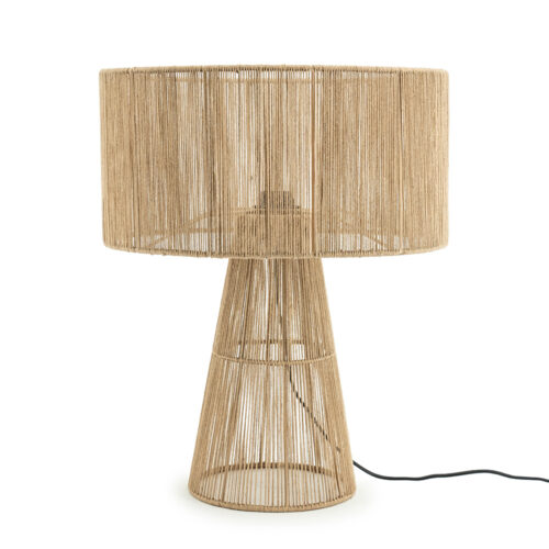 De Oshu tafellamp van By-Boo is een prachtige combinatie van ambacht en modern design. De lamp is vervaardigd van fijne jute touwstructuren die met de hand zijn gespannen over een metalen frame. Dit zorgt voor een open, luchtige vorm en een sfeervol lichteffect zodra de lamp brandt.
