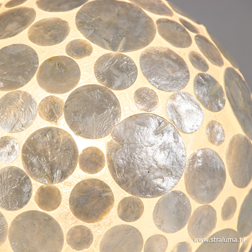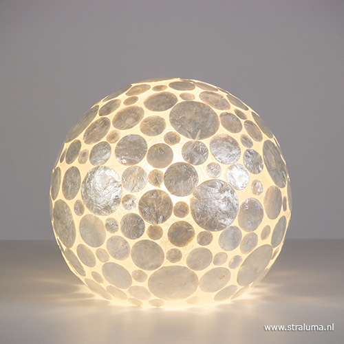 Deze sfeervolle bol brengt het strand in huis. De tafellamp is gemaakt van Capiz schelpen en brengt een warme en gezellige sfeer met zich mee. Zowel aan als uit is de schelpenlamp leuk om naar te kijken, maar vooral aan valt de lamp meteen op en geeft een sfeervolle verlichting. Deze bolvormige tafellamp heeft een zwart snoer met schakelaar.