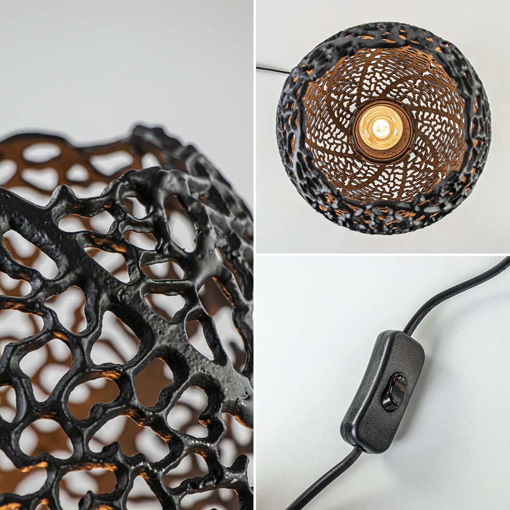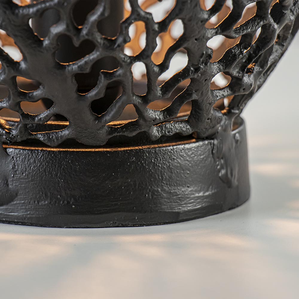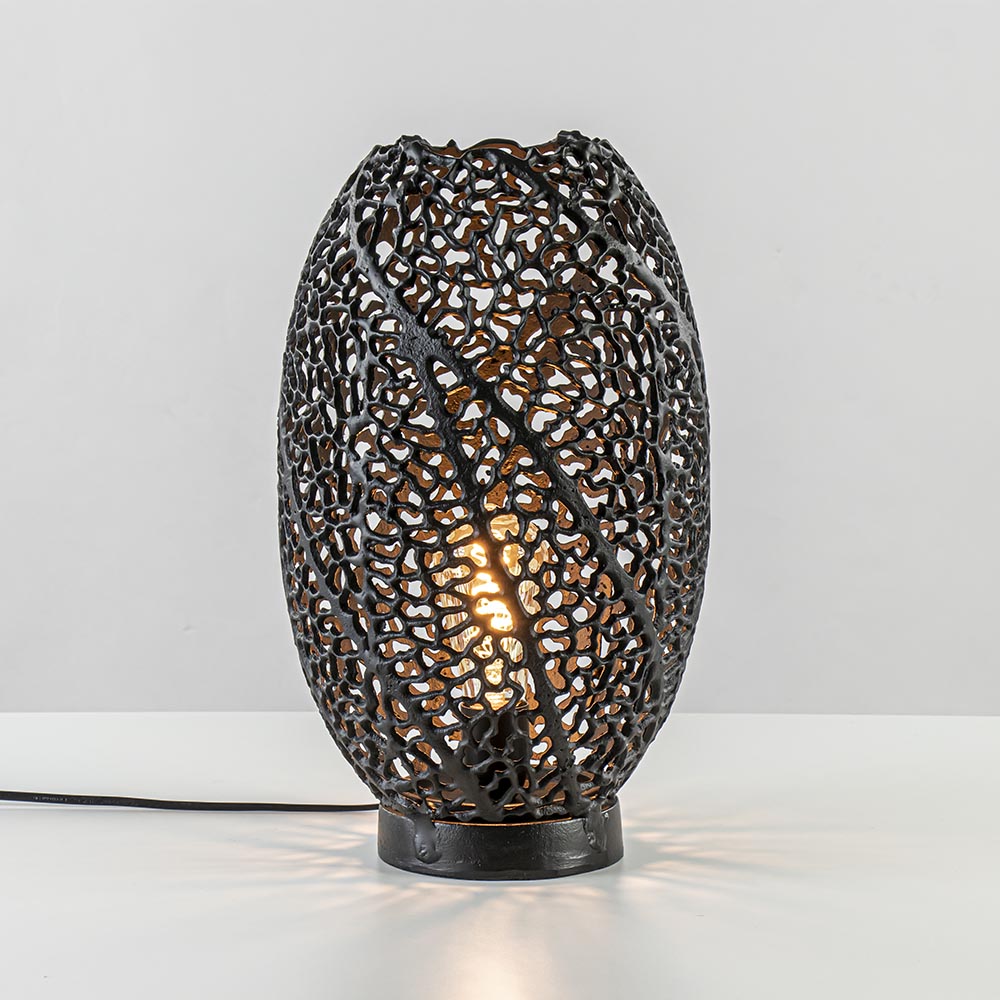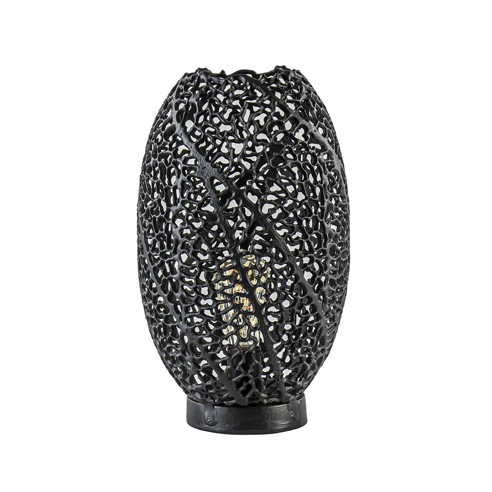 Deze mat zwarte tafellamp heeft een organisch opengewerkt patroon dat doet denken aan de nerven van een blad. Dit geeft de tafellamp een dramatisch uiterlijk. Uitstekend geschikt voor het botanische interieur, maar deze tafellamp sluit ook perfect aan bij het wabi sabi gevoel van het Japandi interieur. Deze lamp staat mooi in de woonkamer op het dressoir of de vensterbank, maar ook in de hal of de slaapkamer! Door de open structuur raden wij u aan om te kiezen voor een decoratieve lichtbron.
