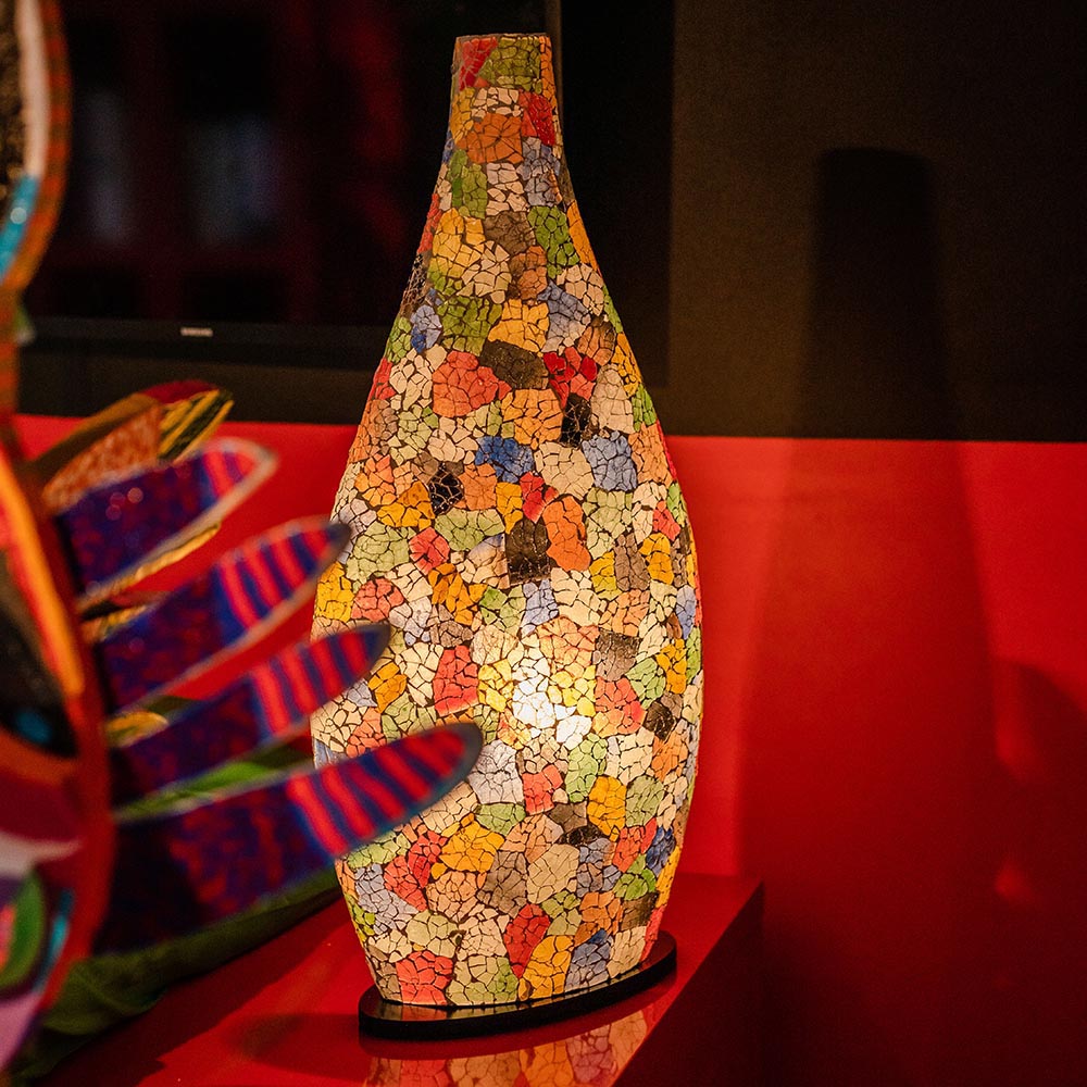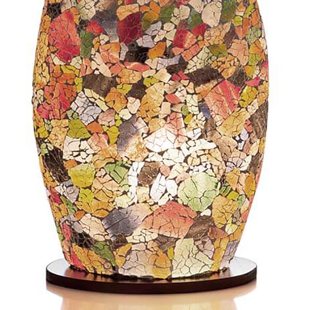Deze lamp is gemaakt van gerecycled glas. De gezellige kleuren en de mooie vorm maken de sfeer in uw interieur. De hoogte van de lamp is 60 cm. Het zwarte snoer heeft een lengte van 180 cm incl. knippertje. Deze lamp maakt deel uit van een leuke serie die bestaat uit diverse tafellampen. De lamp is ook geschikt voor energiezuinige lichtbronnen zoals spaar- en led lampen.