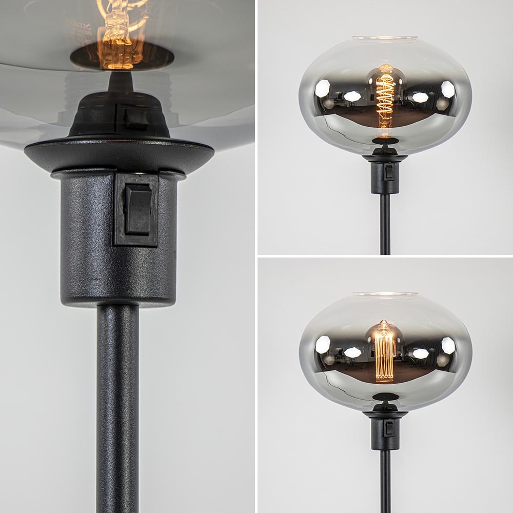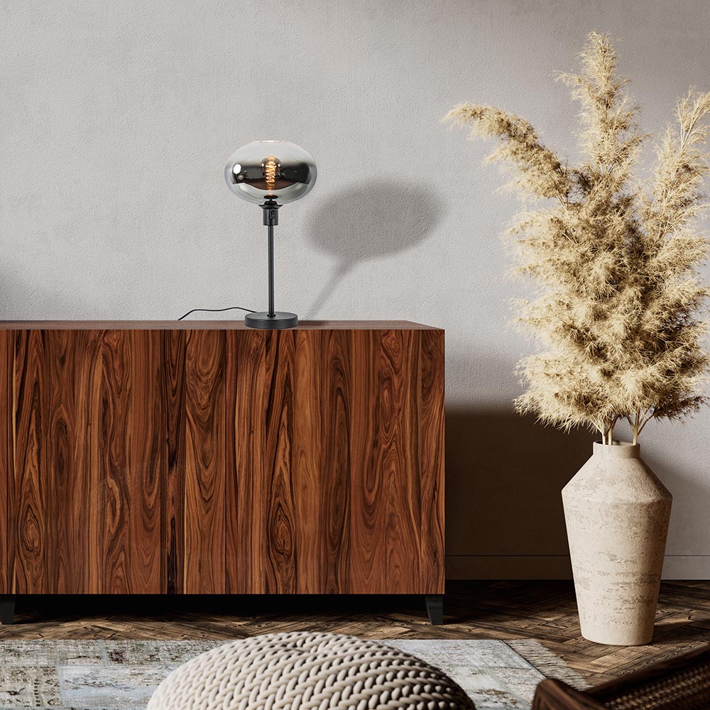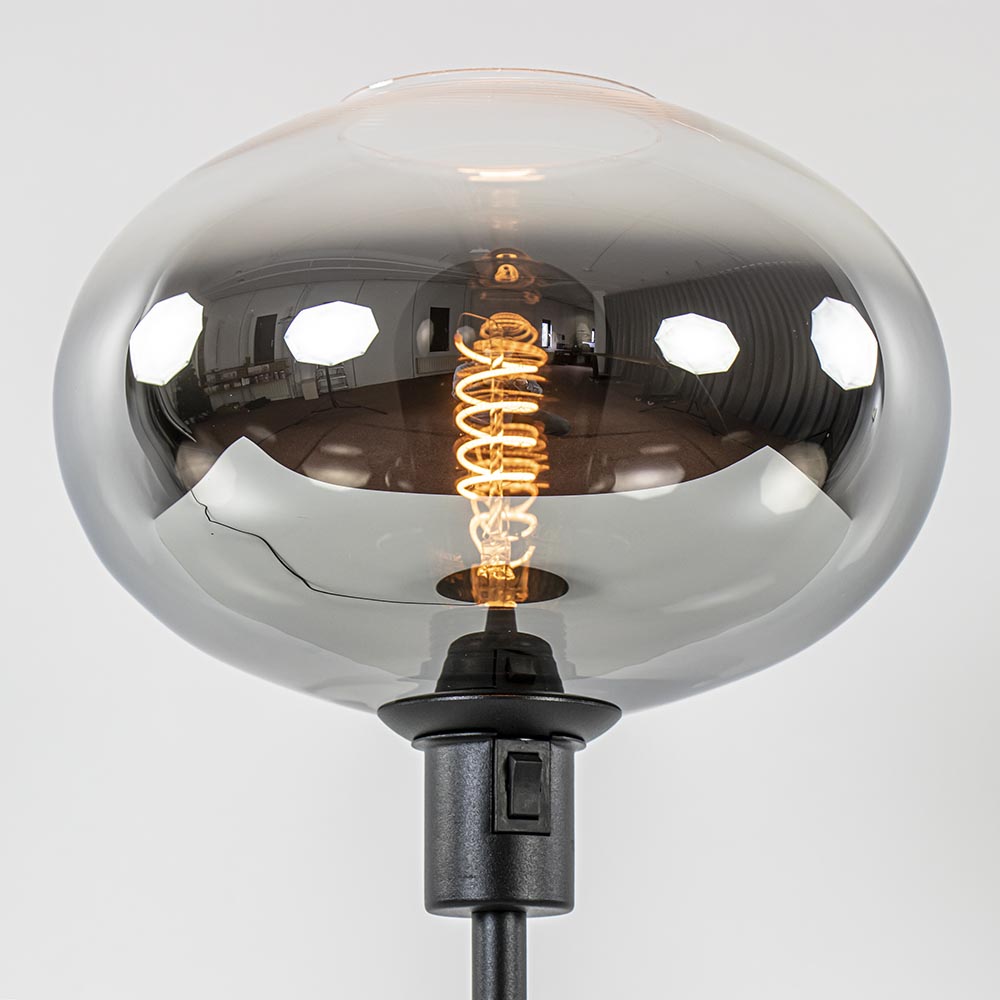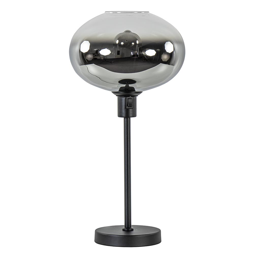 Een mooie verrijking voor een dressoir, bijzettafel of zelfs het nachtkastje. Deze trendy tafellamp voldoet helemaal aan de huidige trends en past in meerdere woonstijlen. Het armatuur is gemaakt van metaal en uitgevoerd in het mat zwart. Ideaal aan dit armatuur is dat deze is voorzien van een schakelaar op het armatuur ipv in het snoer. Zo kunt u gemakkelijk de lamp aan en uit schakelen. Het mat zwarte armatuur biedt ondersteuning aan een smoke glazen kap van 26 cm doorsnede. Het glas heeft een gradient, oftewel een verloop van smoke naar helder. Dit geeft de tafellamp een luxe chique uitstraling. De tafellamp is voorzien van een zwart snoer met en lengte van 150 cm en wordt geleverd exclusief lichtbron (E27).