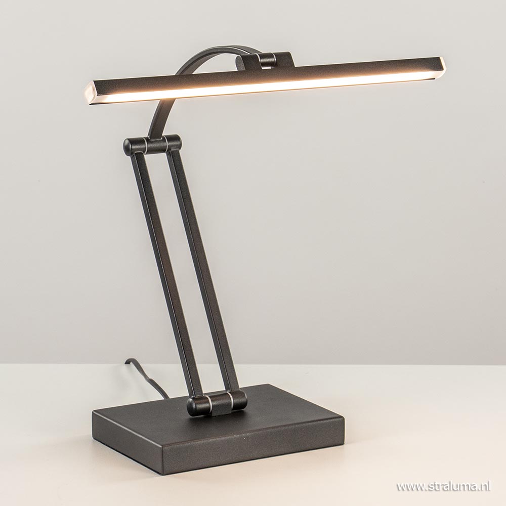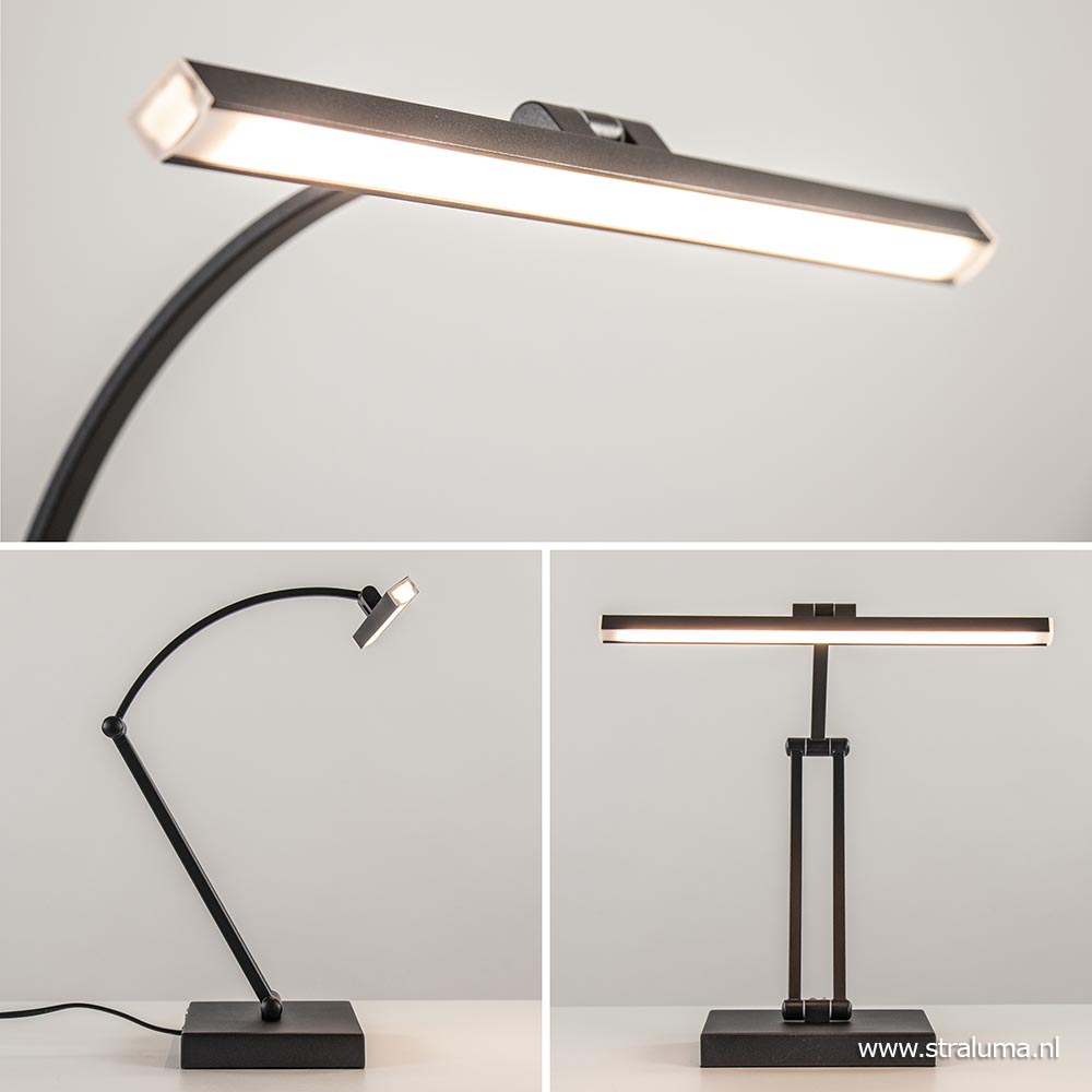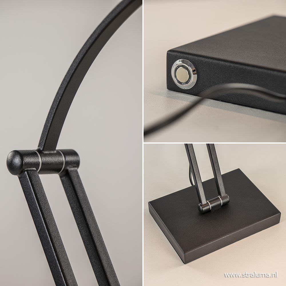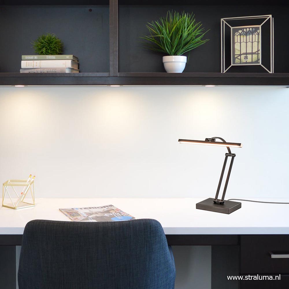 Een ideale bureaulamp voor in uw thuiskantoor. Deze metalen tafellamp is voorzien van LED verlichting wat de lamp energiezuinig maakt. Handig aan de lamp, is dat deze op drie plekken is te verstellen. Zo versteld u gemakkelijk en snel de lamp is de gewenste stand. De zwarte bureaulamp heeft een brede LED strip die dmv de touchdimmer op de achterzijde van de voet naar wens is te dimmen. Ideaal wanneer u gezellig wilt lezen of aan het werk bent. Het LED geeft met 2700 Kelvin een sfeervolle warm witte verlichting. Deze moderne bureaulamp is een ideale werk- en leeslamp.