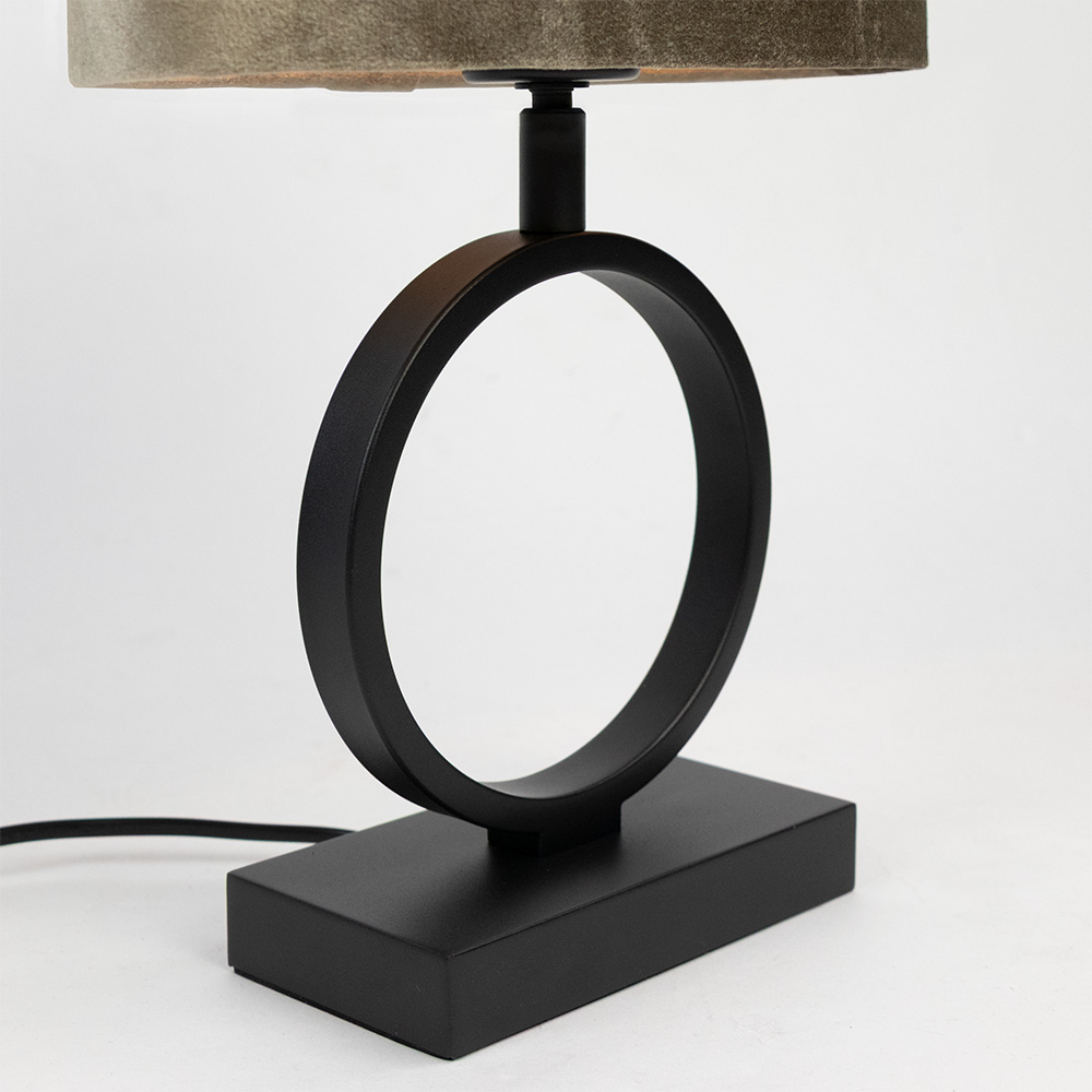 Deze prachtige tafellamp is een echte eyecatcher voor je interieur. De moderne ringvormige voet in een mat zwarte kleur straalt luxe uit en vormt een stijlvol contrast met de fluweelzachte lampenkap in een taupe tint. De ovalen kap zorgt voor een zachte en sfeervolle lichtverdeling, perfect voor in de woonkamer, slaapkamer of hal. Dankzij het unieke ontwerp en de rijke materialen voegt deze lamp niet alleen licht, maar ook karakter toe aan je ruimte. De lamp is voorzien van een snoerschakelaar voor eenvoudige bediening.