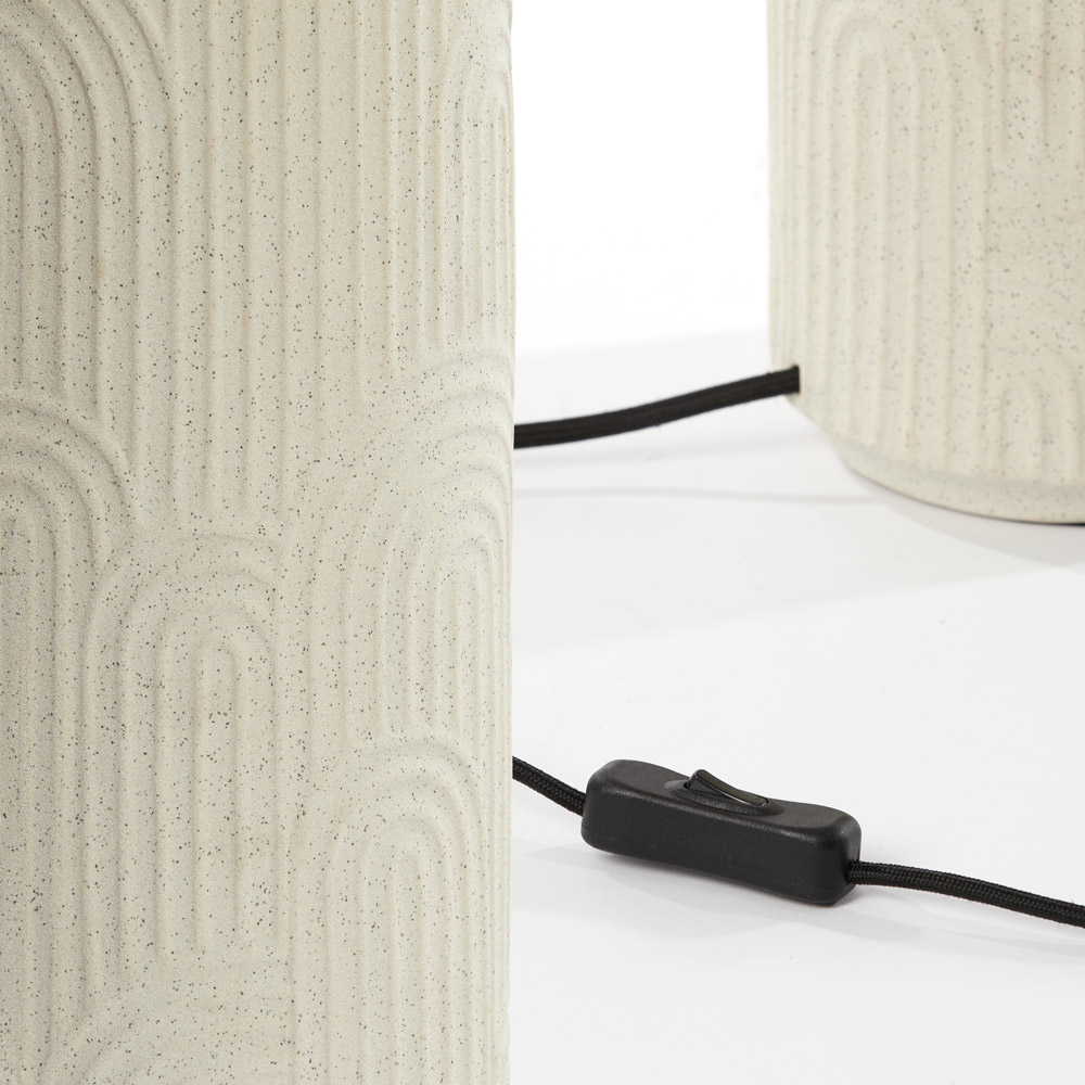 De Diego lampenvoet onderscheidt zich door het subtiele reliëf van afgeronde, grafische vormen die rondom in het keramiek zijn verwerkt. De zachte ecru kleur met fijne spikkeling geeft de lamp een natuurlijke en warme uitstraling, terwijl het patroon zorgt voor een speels maar verfijnd accent.