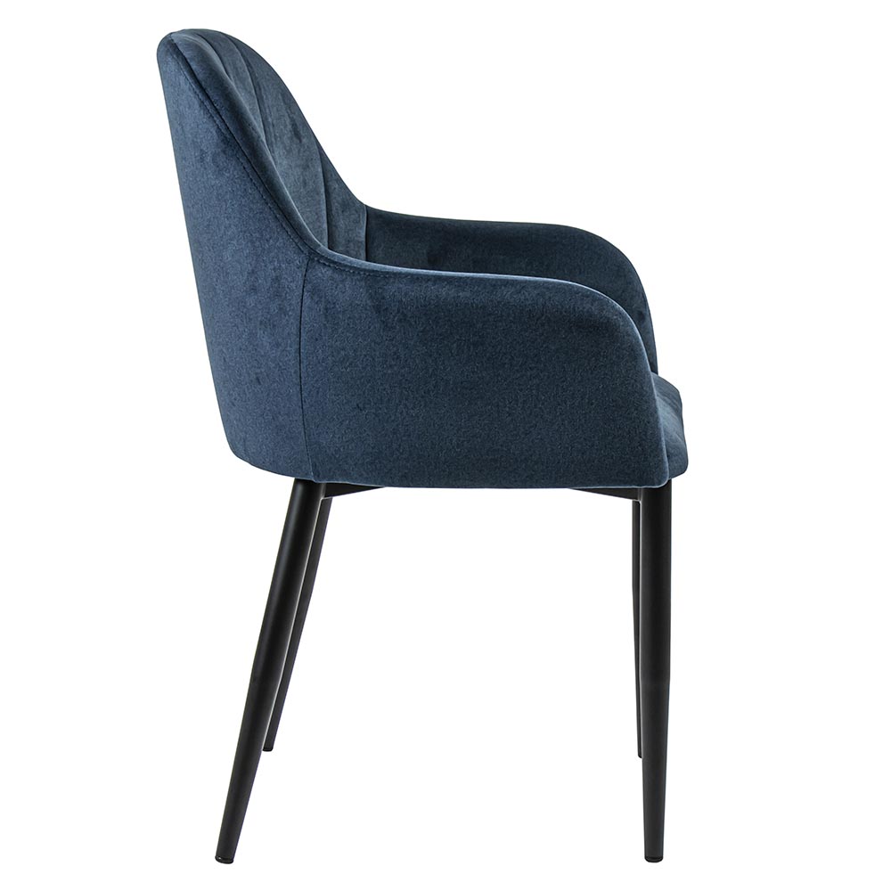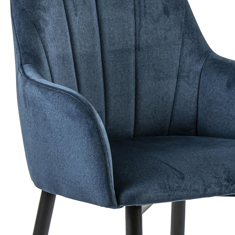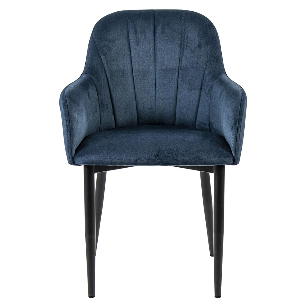 – afm: 57x55x85 cm – zithoogte: 47 cm – zitdiepte: 45 cm – zitbreedte: 43 cm – armleuning: 63 cm – materiaal zitting: stof, velours – kleur zitting: blauw – materiaal poot: metaal – kleur poot: zwart