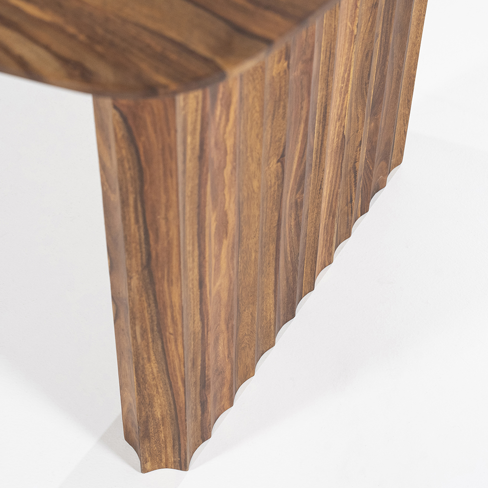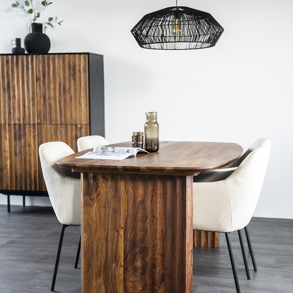 Deze trendy eettafel past helemaal binnen de huidige woontrends. De rechthoekige eettafel is volledig gemaakt van Sheesham hout en heeft een robuust blad met afgeronde hoeken. De twee poten zijn ook van Sheesham hout en zijn voorzien van een reliëf. Het hout heeft een donkere warme tint die mooi is toe te passen in diverse woonstijlen. De tafel heeft een afmeting van 240×100 cm en biedt genoeg ruimte om heerlijk met 6 personen te dineren.