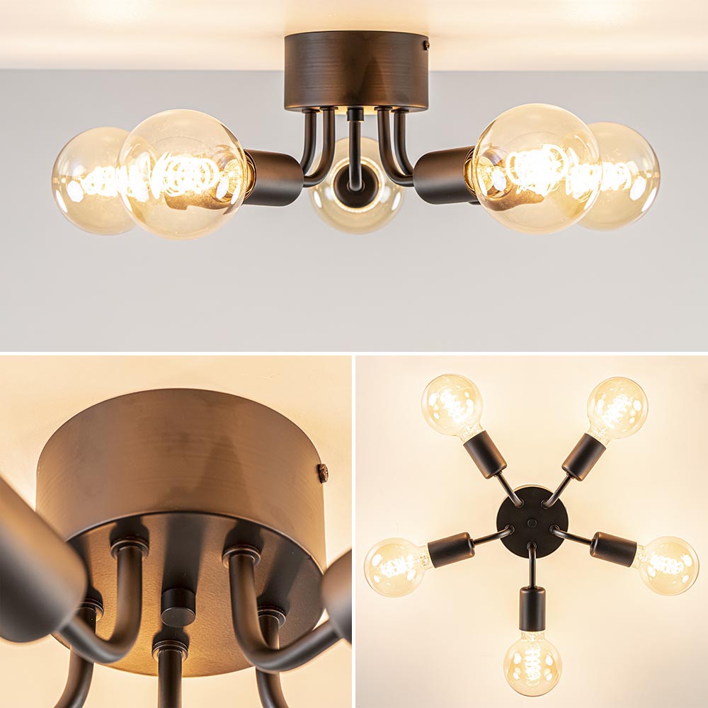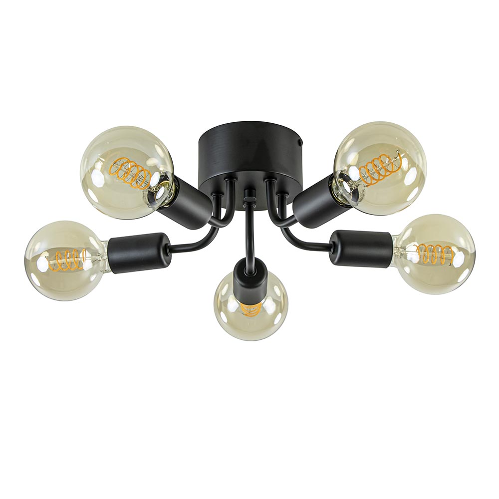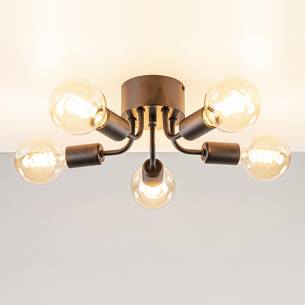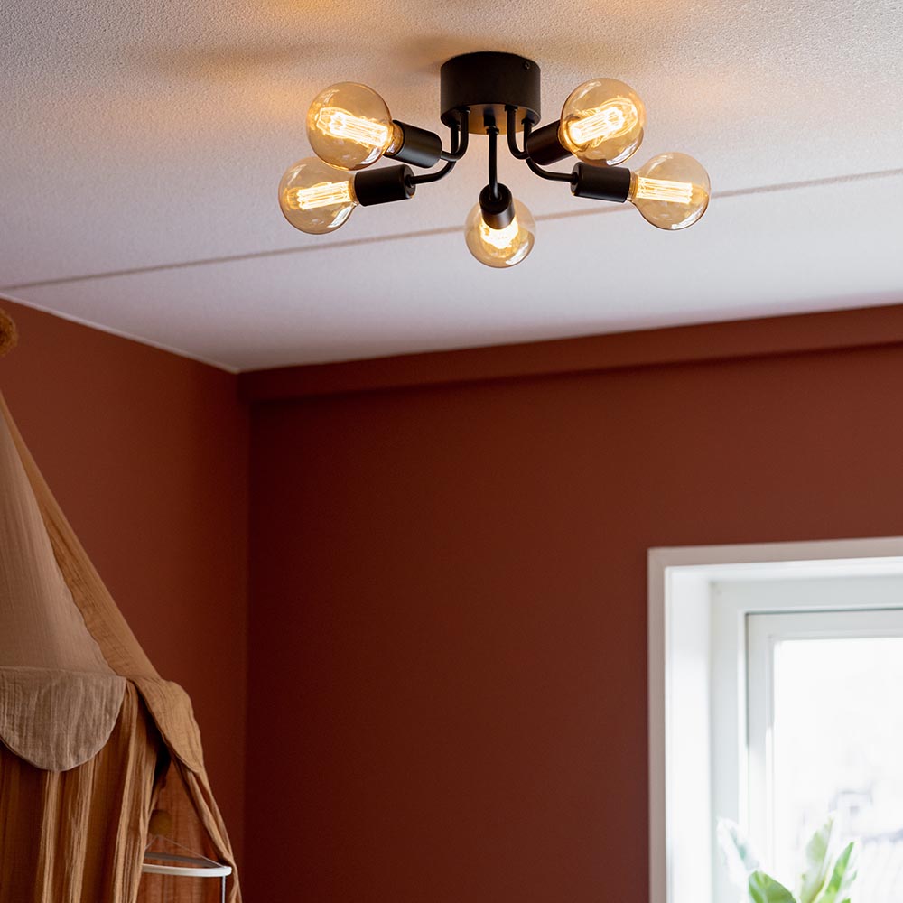 Bent u op zoek naar dé geschikte plafondlamp voor in uw kamer? Dan is deze plafondlamp 5-lichts zwart precies waar u naar op zoek bent! Deze mat zwarte plafondlamp is een echte sfeerbrenger in huis. Het is aan u welke sfeer deze lamp met zich mee zal gaan brengen. Waarom vraagt u zich af? Deze 5-lichts plafondlamp wordt geleverd exclusief lichtbronnen, wat betekent dat u dé juiste lichtbronnen uit moet kiezen naar uw smaak! Zo kunt u bijvoorbeeld de keuze maken uit smoke-lichtbronnen of gold-lichtbronnen. De smoke-lichtbronnen geven door hun donkere glans een vooral moderne en chique uitstraling. De gold-lichtbronnen geven daarentegen warm en sfeervol licht. Houdt u van een chique stijl? Deze plafondlamp 5-lichts is ook verkrijgbaar met gouden fittingen! Aan u de keuze!