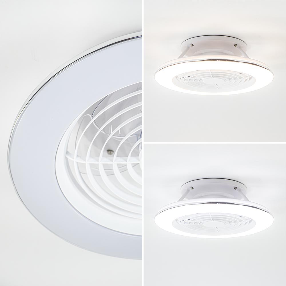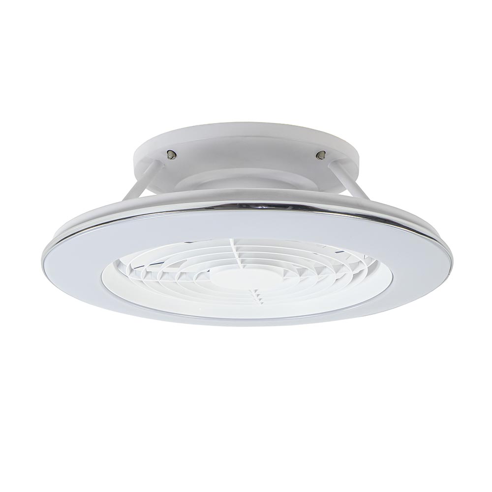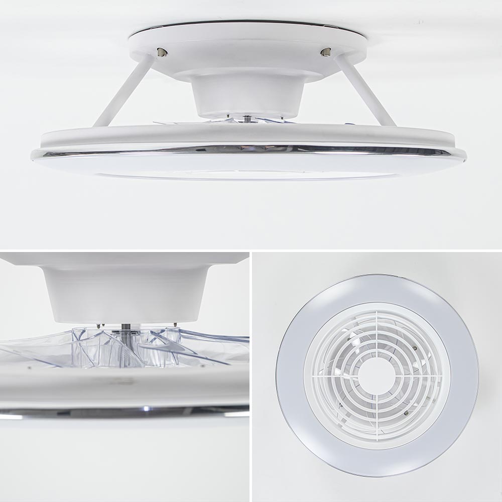 Een moderne variant van de klassieke plafondventilator. Deze wit met chromen ventilator en plafondlamp in één doorbreekt de standaard modellen met de losse bladen. Deze strakke ventilator bestaat uit twee delen, de buitenste ring is voorzien van geïntegreerd LED en de binnenste ring behuisd de ventilator. Het mooie is ook nog dat de ventilator en de lamp zijn te bedienen via de meegeleverde afstandsbediening, zo stelt u snel de gewenste snelheid van de ventilator in of dimt u de verlichting. Deze is in te stellen qua kleur en intensiteit, ideaal voor in de woonkamer of slaapkamer. Een ventilator is nog nooit zo strak en gemakkelijk bedienbaar geweest.