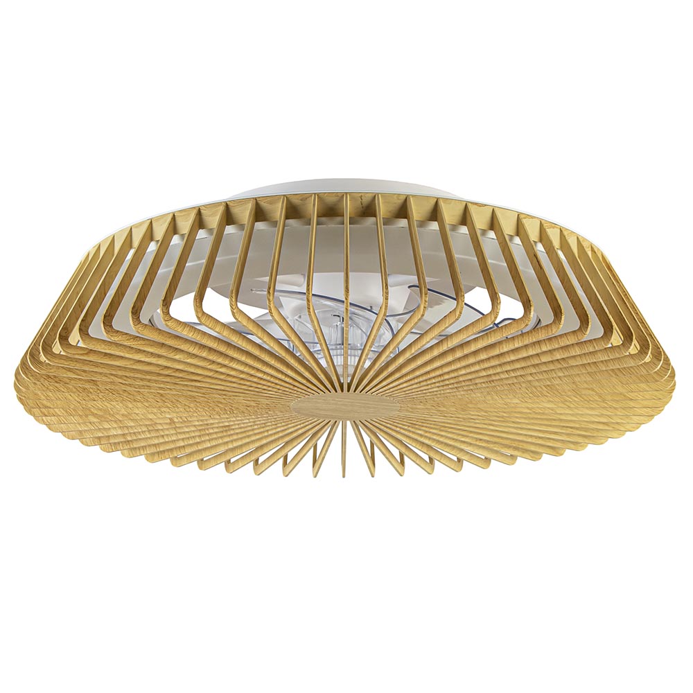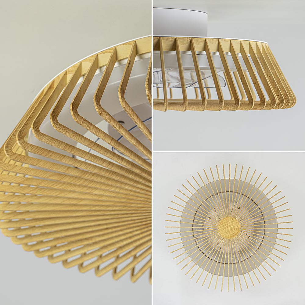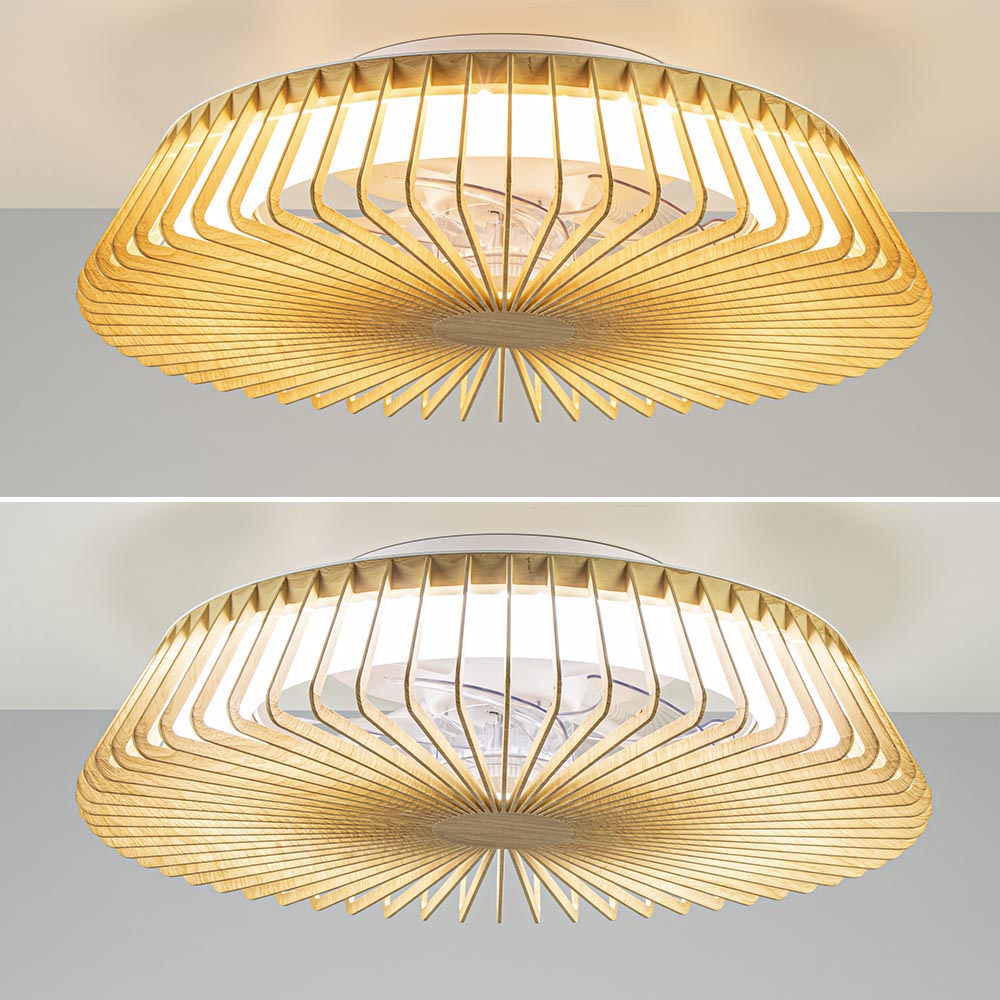 Een moderne design plafondventilator met LED zoals we deze nog niet eerder hebben gezien. De ronde ventilator oogt meer als een plafondlamp dan een ventilator maar deze heeft beide functies in één. De fraaie kap met hout-look geeft de plafondventilator een frisse uitstraling. De moderne plafondventilator, met ledlichtbron, is voorzien van diverse functies. Zo kunt u de kleurtemperatuur kiezen tussen de 2700 en 5000 Kelvin en kunt u de lamp eenvoudig dimmen. Dit bediend u allemaal gemakkelijk met de bijgeleverde afstandsbediening of via een app op uw mobiele telefoon. Deze verbindt u d.m.v. Bluetooth met de lamp zodat u vanaf uw bank, bed of luie stoel snel de gewenste instelling kunt maken. Kortom, een ideale plafondlamp en ventilator in één met een mooie design uitstraling.
