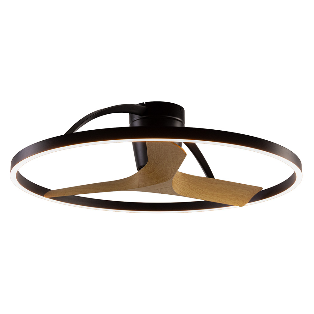 Strak, modern en functioneel! Deze ventilatorlamp combineert verlichting en verkoeling in één stijlvol ontwerp. De plafondlamp is uitgevoerd met een ronde zwarte metalen omlijsting en een geïntegreerde LED-ring die zorgt voor een gelijkmatige en sfeervolle verlichting. In het midden bevinden zich drie elegante bladen met een natuurlijke houtlook die zorgen voor een rustige luchtcirculatie in de ruimte. Dankzij de bijgeleverde afstandsbediening stel je eenvoudig zowel de lichtsterkte als de kleurtemperatuur (van warm wit tot koel wit) in. Ook de ventilator is in verschillende snelheden te regelen, voor een optimaal comfort het hele jaar door. Ideaal voor werkruimtes, woonkamers of slaapkamers waar stijl en functionaliteit samenkomen.