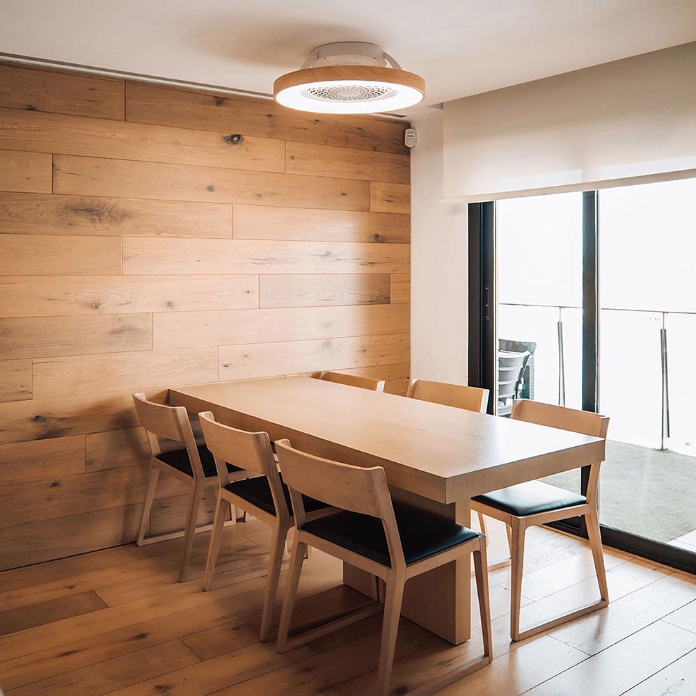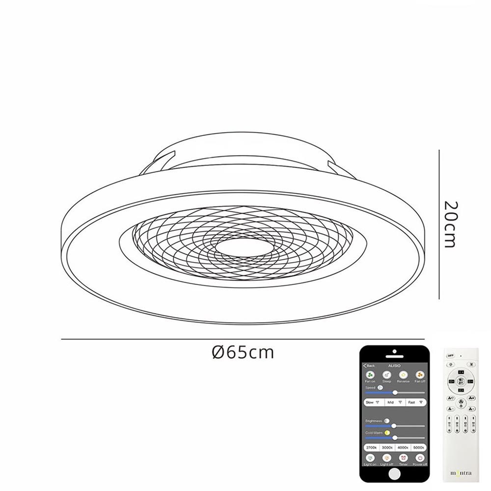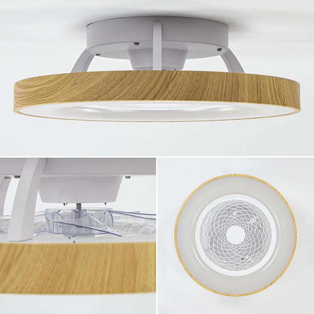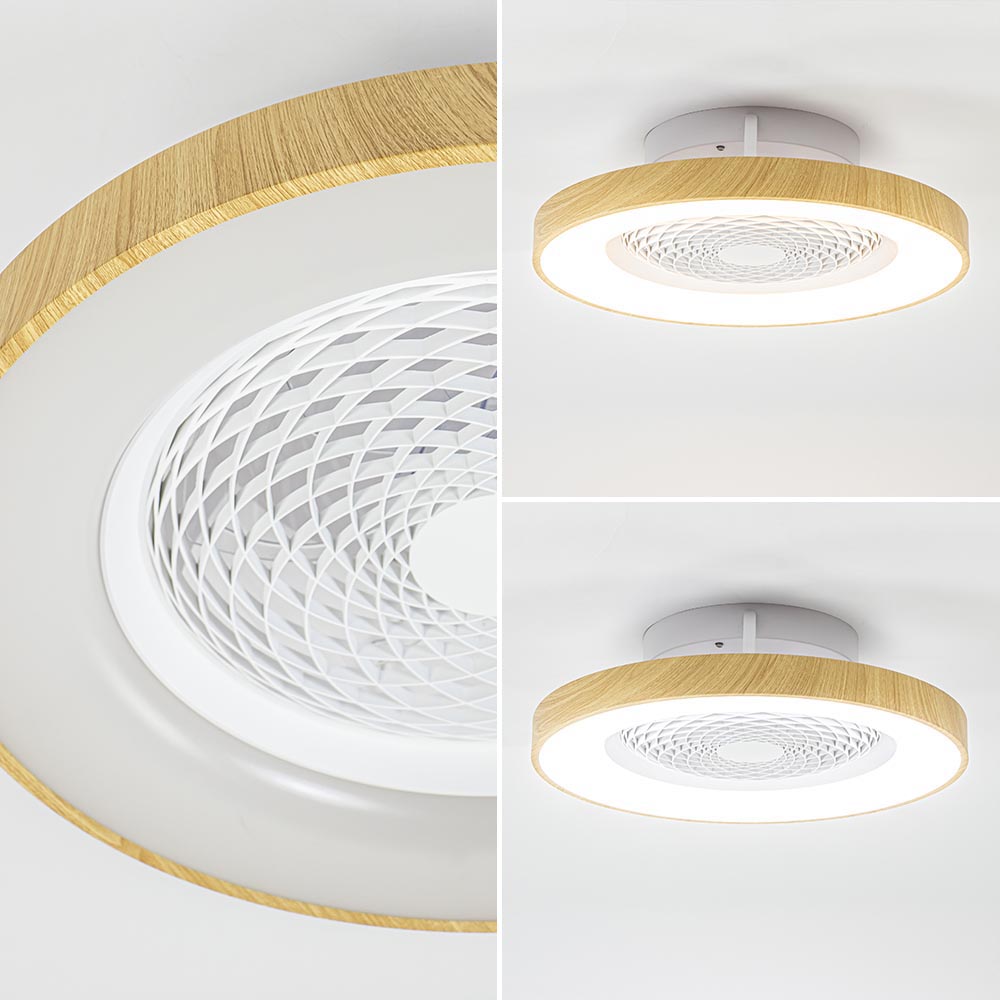 Een moderne plafondventilator met een strak design. Deze ronde ventilator bestaat uit twee delen, de buitenste houten ring is voorzien van geïntegreerd LED en de binnenste witte ring behuisd de ventilator. Het mooie is ook dat de ventilator en de lamp zijn te bedienen via de meegeleverde afstandsbediening, maar ook gemakkelijk met uw smartphone. Middels een app en bluetooth linkt u de ventilator gemakkelijk met uw smartphone en stelt u snel de gewenste snelheid van de ventilator in of dimt u de verlichting. De LED verlichting is in te stellen qua kleur en intensiteit, ideaal voor in de woonkamer of slaapkamer. De wit met houten plafondventilator met lamp heeft een zomer en een winter stand zodat u deze het hele jaar door kunt gebruiken.