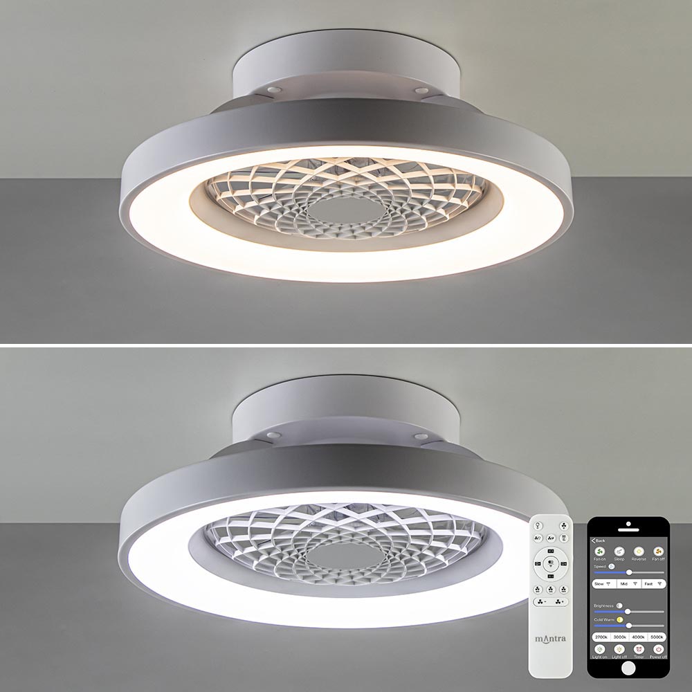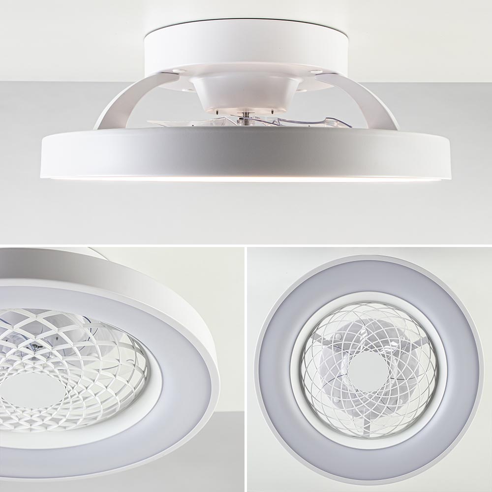 Een moderne plafondventilator met een strak design. Deze ronde ventilator bestaat uit twee delen, de buitenste ring is voorzien van geïntegreerd LED en de binnenste ring behuisd de ventilator. Het mooie is ook dat de ventilator en de lamp zijn te bedienen via de meegeleverde afstandsbediening. U stelt gemakkelijk en snel de gewenste snelheid van de ventilator in of dimt de verlichting. De LED verlichting is in te stellen qua kleurtemperatuur en intensiteit, ideaal voor in de woonkamer of slaapkamer. De moderne plafondventilator met lamp heeft een zomer en een winter stand zodat u deze het hele jaar door kunt gebruiken.