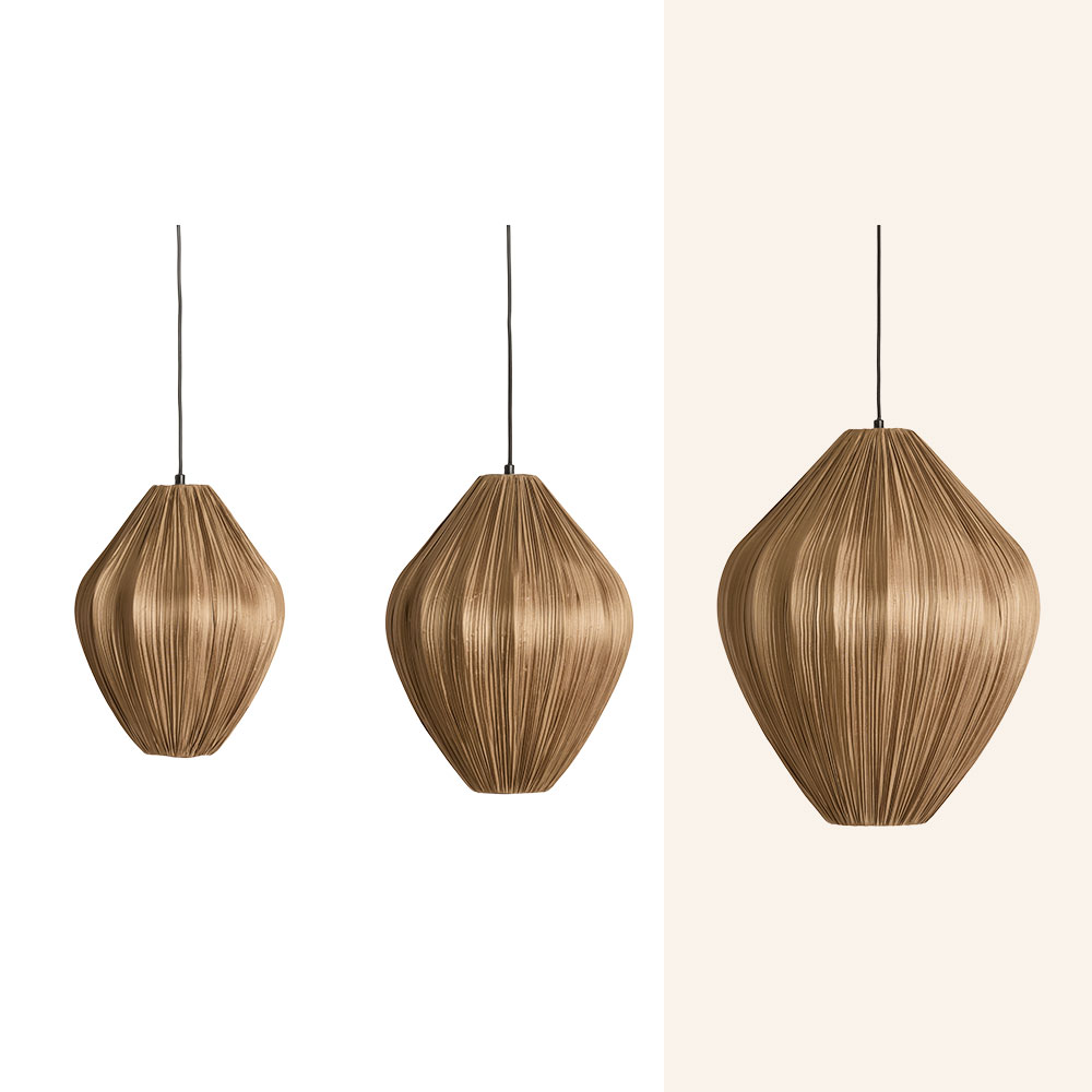 Specificaties: • Serie: Verita • Kleur: Brons/bruin • Afmetingen: S: Ø 31 × H 38 cm M: Ø 36 × H 44 cm L: Ø 47 × H 55 cm • Snoer: 150 cm, in te korten • Materiaal: Metaal en stof • Fitting: E27 (lichtbron niet inbegrepen) • Dimbaar: Ja, via externe dimmer