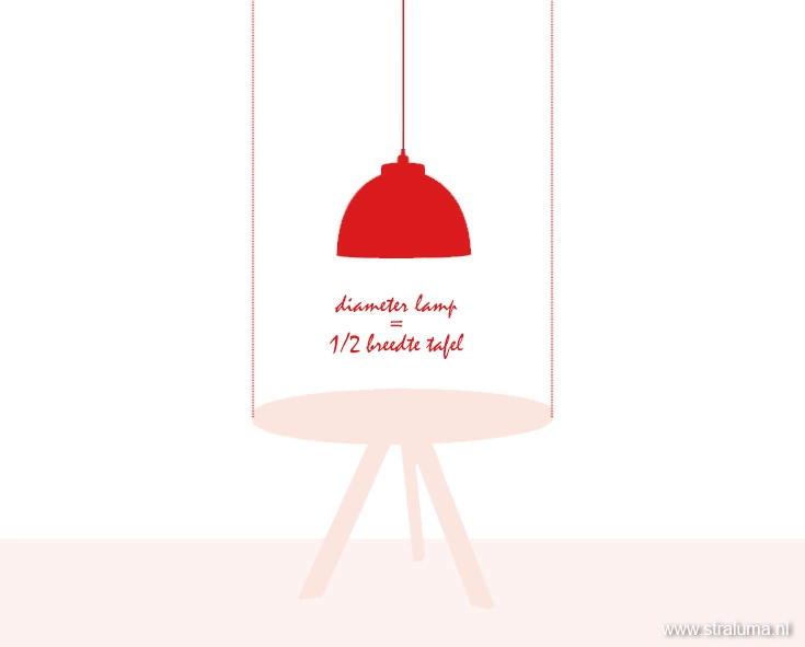 Dit is afhankelijk van de eettafel. De vuistregel is maximaal de helft van de breedte van de tafel. Boven een eettafel van 100 x 200 cm hang je een lamp met een maximale breedte van 50 cm. Boven een ronde eettafel van 90 cm hang je dus een lamp met een maximale diameter van 45 cm. Wanneer je voor een grotere lamp kiest, zal de lamp gigantisch voelen!