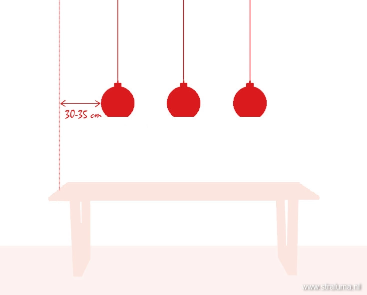 Bij het opstaan komt je lichaam naar voren. Dit heeft te maken met balans, evenwicht en andere natuurkundige principes. Zonder ingewikkelde formules komt het erop neer dat als je lamp tot de rand van de tafel komt, je je hoofd stoot bij het opstaan. Om dit te voorkomen zorg je ervoor dat er 30 – 35 cm ruimte overblijft. Een lamp van 130 – 140 cm breed boven een eettafel van 200 cm past perfect.
