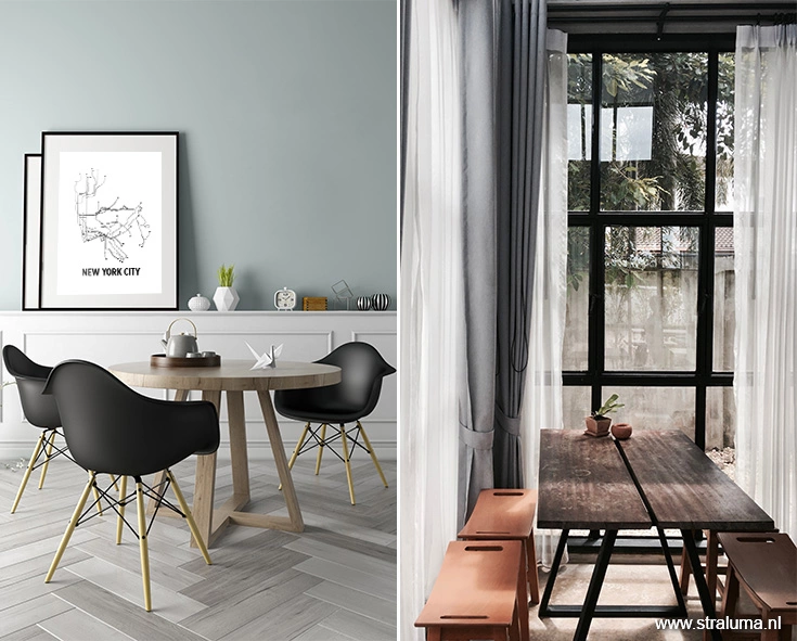 Ovaal is de beste vorm voor een tafelblad. De lengte van een lange tafel, de gezelligheid van een ronde tafel en ziet er super uit, al het goede zonder de minpunten. Geen wonder dat de ovalen tafel aan terrein wint in de wereld van het interieur. Lastiger bij een ovalen tafel is de verlichting. Omdat de tafel bij de punten smaller wordt zal je met grotere lampen al gauw tegen de lamp lopen. De oplossing is een lamp met meerdere kleine lampen naast elkaar, of een aantal losse kleine lampen.