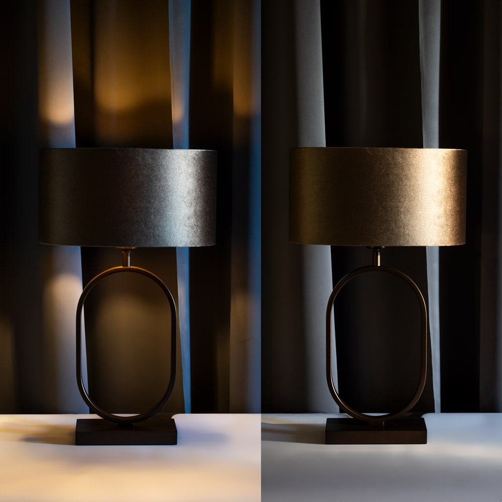 De Verona tafellamp is een elegante sfeermaker met een compact en verfijnd ontwerp. Het slanke metalen frame in bruin wordt gecombineerd met een goudkleurige ovale kap, die zorgt voor een warme en gelijkmatige lichtverspreiding. Dankzij zijn rustige vormgeving past deze tafellamp moeiteloos in zowel moderne als warme, klassieke interieurs.