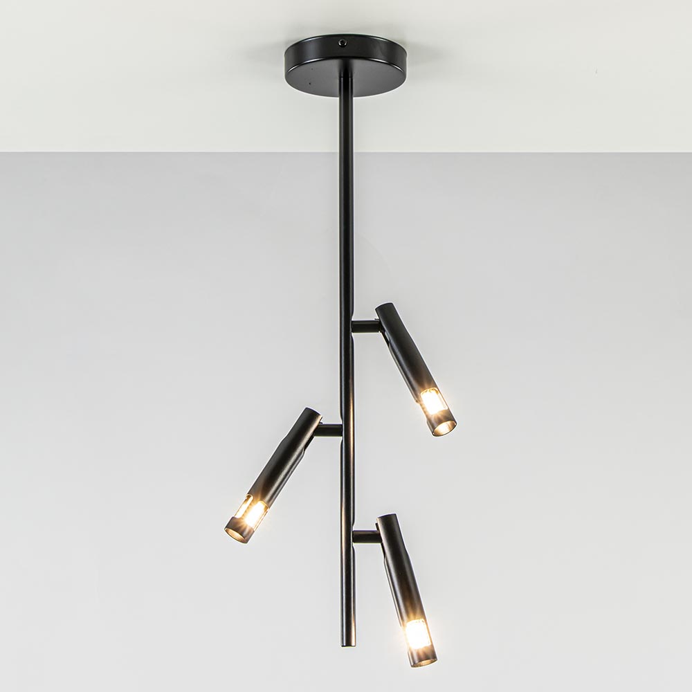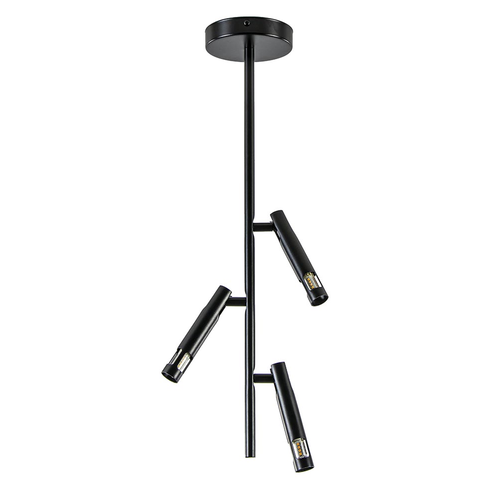 Een moderne opbouwspot met een strak minimalistisch design. De plafondlamp is volledig van metaal en uitgevoerd in het zwart. Het zwarte armatuur ondersteund drie smalle kappen die zijn voorzien van een G9 fitting. Beide kapjes zijn naar wens te verstellen door deze te draaien of te kantelen. De plafondlamp past prima in een hal, kleine kamer of het toilet. De G9 lichtbronnen zijn exclusief.