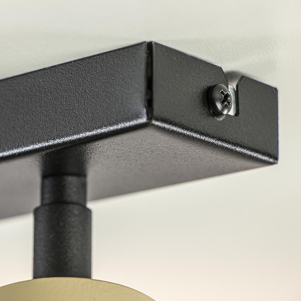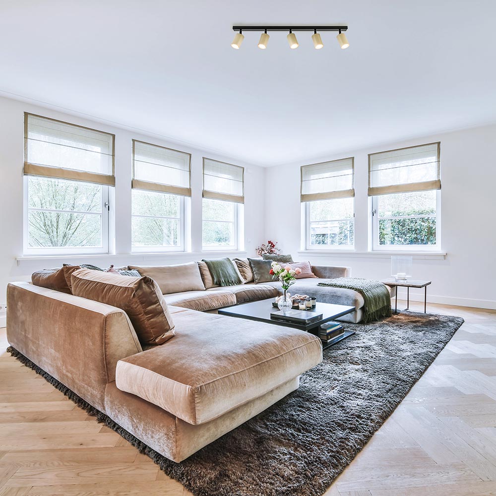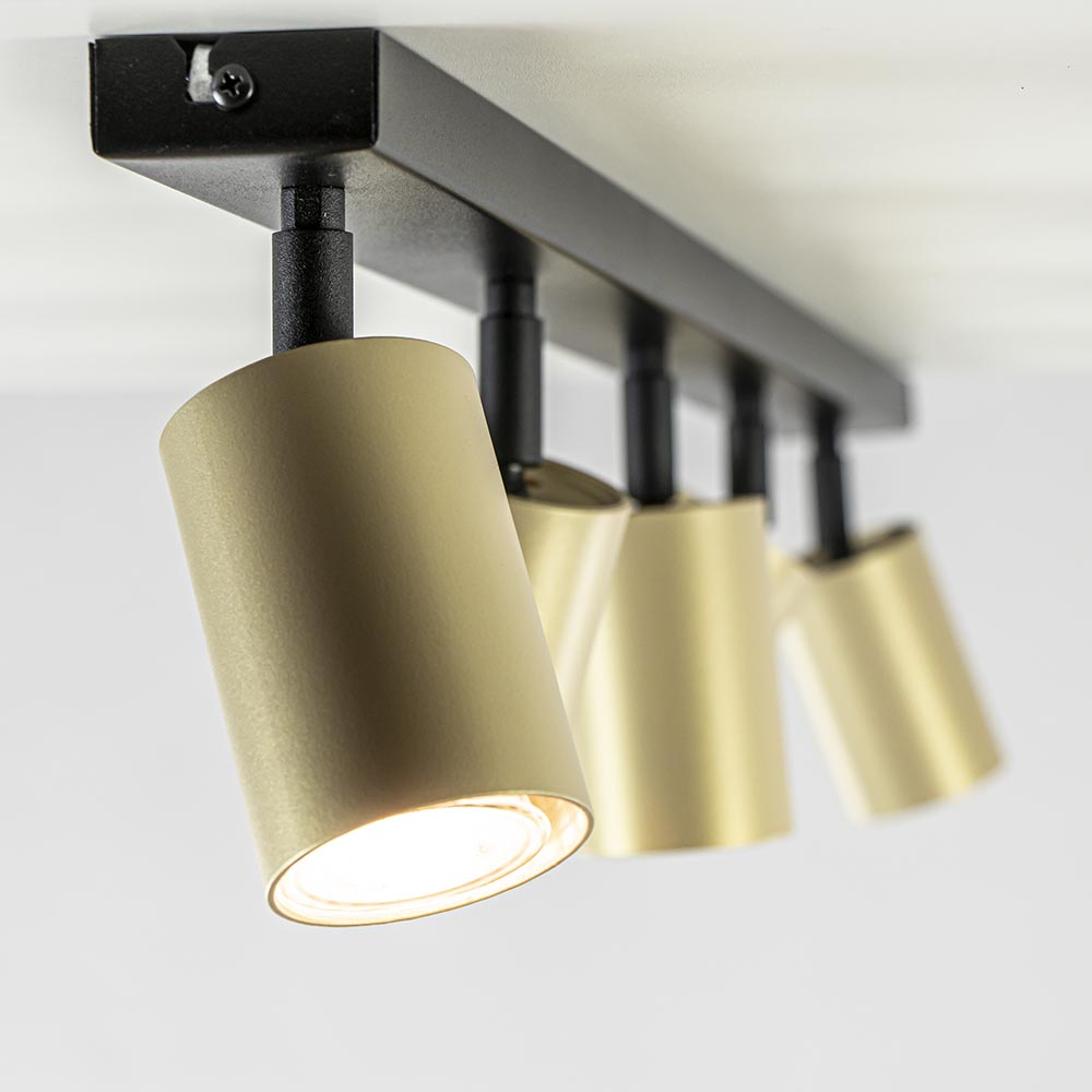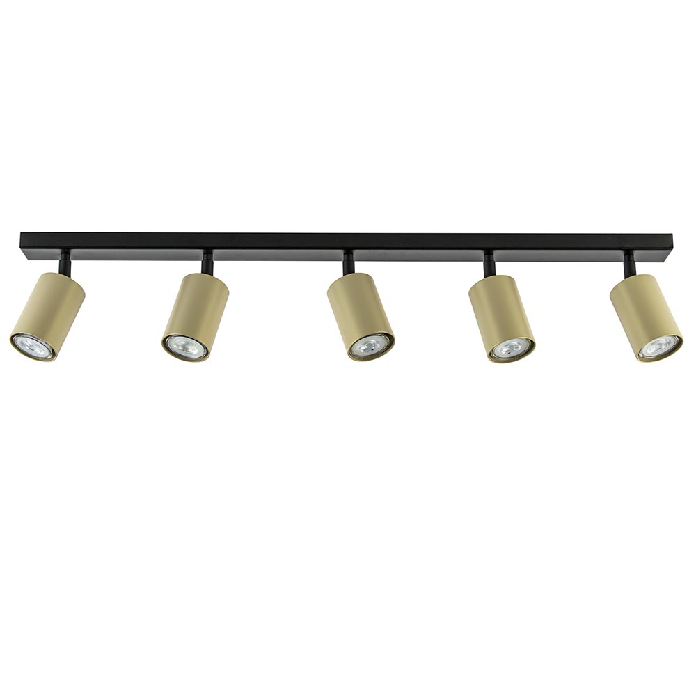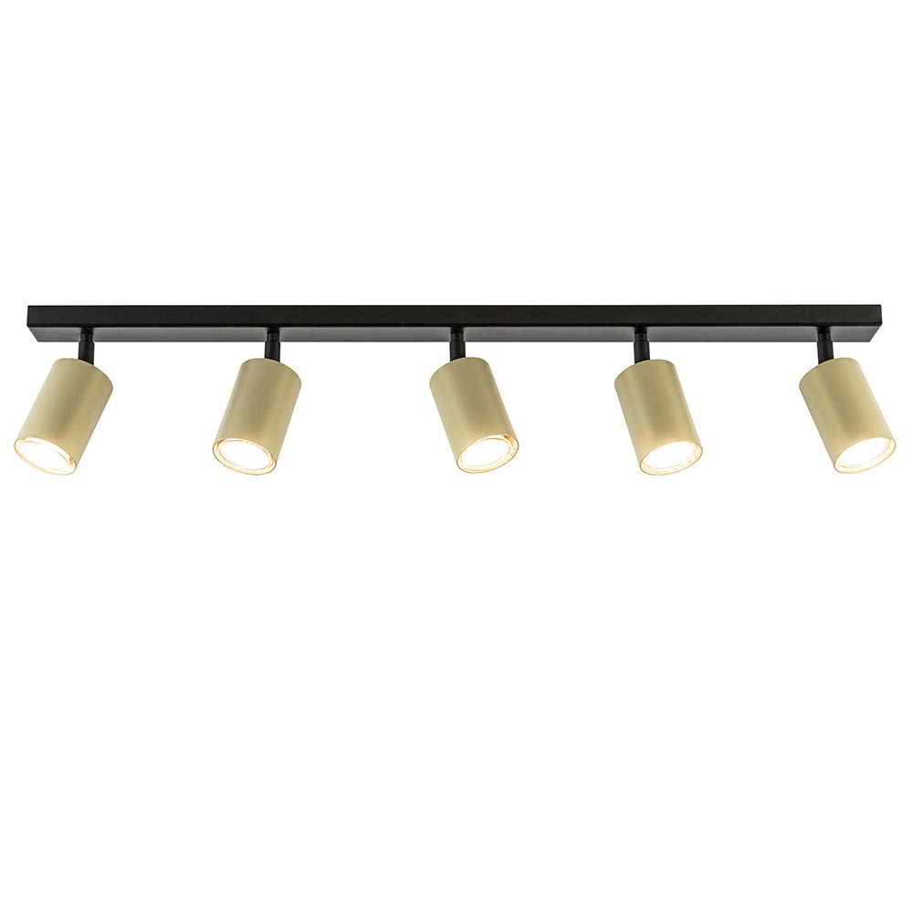 Heeft u een lange hal of kamer? Dan is dit de ideale lamp om de ruimte goed uit te lichten. Deze 5-lichts opbouwspot heeft een strakke moderne afwerking en past gemakkelijk in diverse woonstijlen. De langwerpige plafondspot is gemaakt van metaal en uitgevoerd in het goud met mat zwart. De cilinder vormige spots zijn naar wens te verstellen door deze te draaien en/of te kantelen. Zo kunt u ze gemakkelijk verstellen en zo de ruimte op de beste wijze uitlichten. De 5 gouden spots zijn bevestigd op een smalle balk van 80 cm die in het mat zwart is afgewerkt. De moderne opbouwspot wordt geleverd zonder lichtbron (5x GU10) en is dimbaar middels een externe dimmer (exclusief).