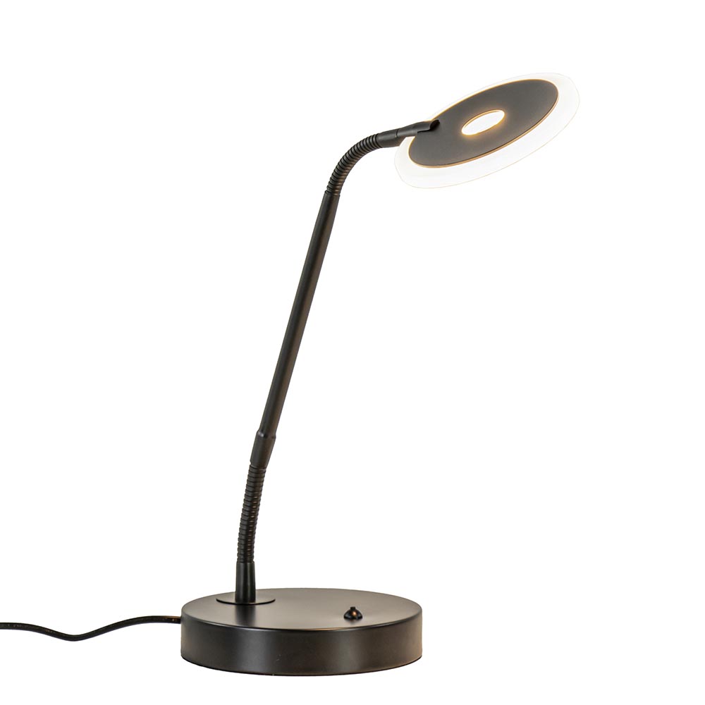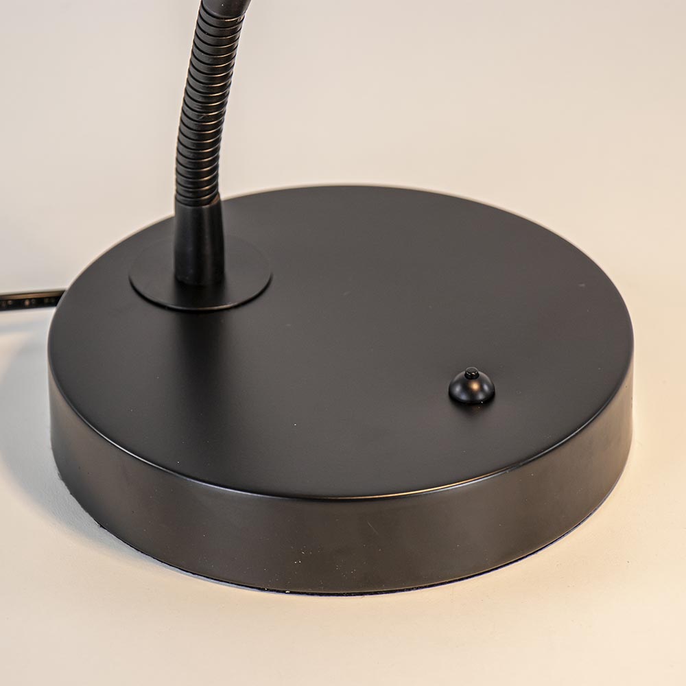 Een zeer functionele tafellamp die tevens perfect kan dienen als bureaulamp. De lamp heeft een moderne uitstraling en is afgewerkt in een mat zwarte finish. Het ideale aan de bureaulamp is dat deze is voorzien van LED, wat de lamp energiezuinig maakt, en ook nog eens dimbaar is in zowel intensiteit als kleur. Dit werkt gemakkelijk met de pushdimmer op de voet van de lamp. Per keer dat u erop drukt dimt de lamp verder in kleur, ingedrukt houden is in intensiteit. Daarnaast is de moderne LED lamp op drie plekken te verstellen. Zo kan het armatuur op twee plekken kantelen en is de ronde LED kap ook nog eens te draaien. Zo zorgt u er altijd gemakkelijk en snel voor dat u de gewenste sfeer en stand creëert. De moderne tafellamp heeft een zwart snoer van 170 cm.