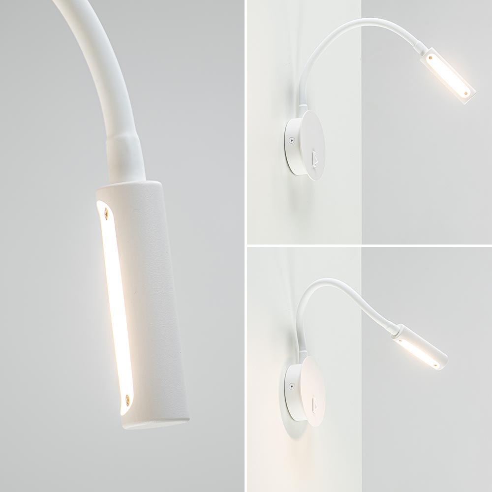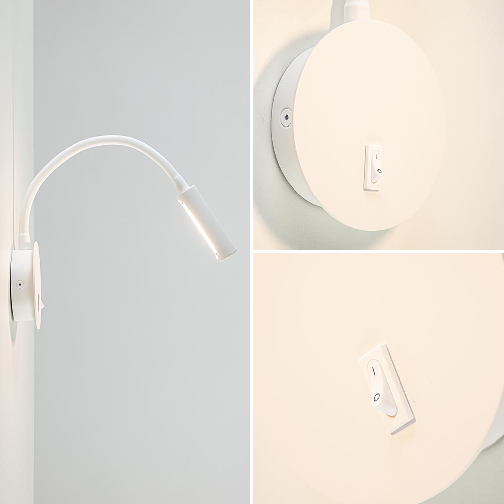 Een perfect lampje voor naast uw bed. De kleine wandlamp is gemaakt van metaal en uitgevoerd in het wit. Dit geeft het wandlampje een moderne look. Ideaal aan de witte wandlamp is dat deze is voorzien van een flexibele arm zodat u gemakkelijk de arm kunt verstellen. Erg handig wanneer u voor het slapen nog even wilt lezen. De verstelbare wandlamp is verder voorzien van geïntegreerd LED en heeft een schakelaar op de ronde bevestiging. De moderne wandlamp is niet voorzien van een snoer en dient dan ook direct op een stroompunt te worden aangesloten.