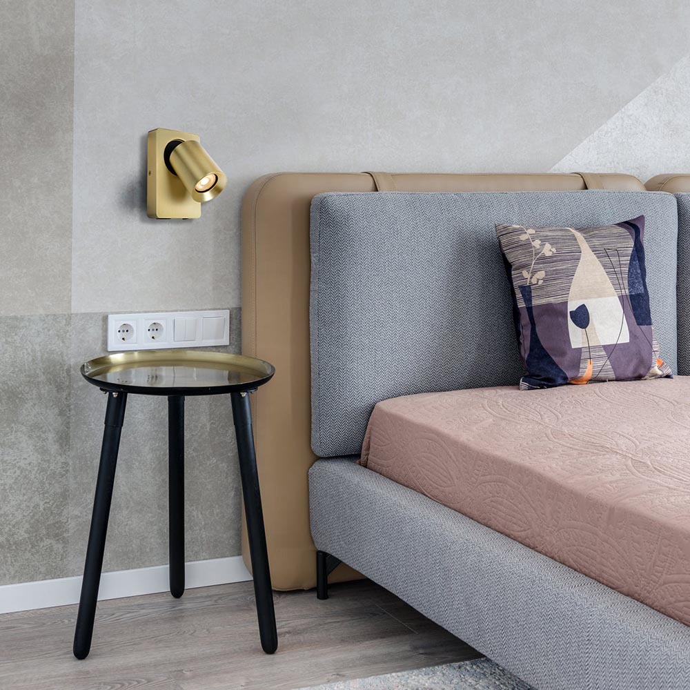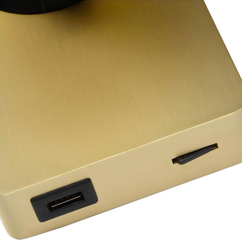 Een ideale wandlamp voor naast het bed, in de hal of bij de bank. De trendy wandlamp is voorzien van een cilinder vormige spot welke zowel kan draaien als kantelen om zo de lichtrichting perfect te stellen. De wandlamp is gemaakt van aluminium en uitgevoerd in het mat goud. Dit maakt de wandspot prima te combineren in diverse woonstijlen als trendy, chic of klassiek. De wandlamp is aan de onderzijde voorzien van een aan/uit schakelaar en een USB aansluiting. Ideaal voor het opladen van de smartphone of tablet. De mat gouden wandlamp is verder voorzien van een LED lichtbron met een dim to warm functie.