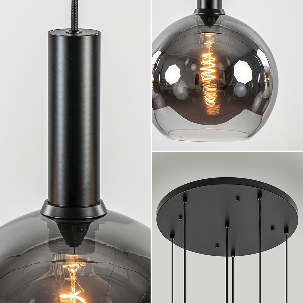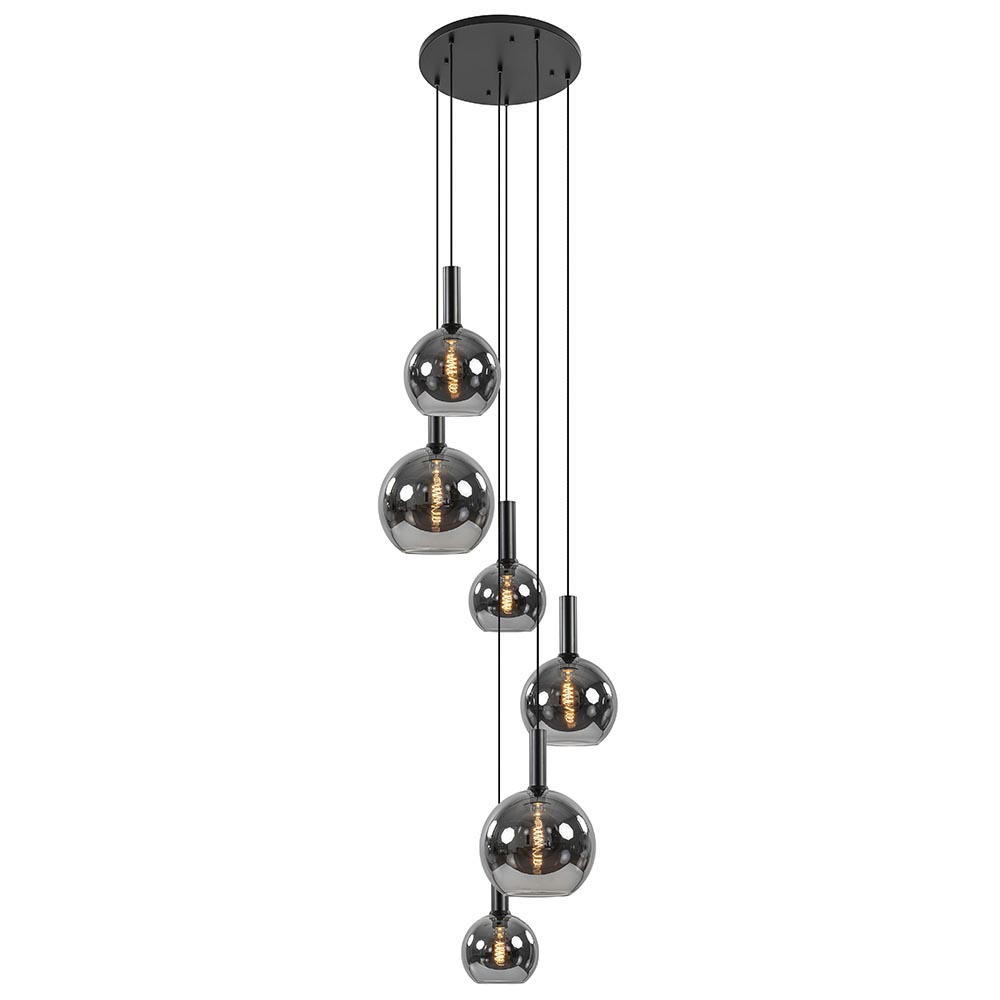 Een prachtige hanglamp voor in de vide of een ruimte met een hoog plafond. Deze 6-lichts hanglamp heeft namelijk een hoogte van maar liefst 4 meter. De videlamp wordt aan het plafond bevestigd met een grote mat zwarte ronde plaat van 45 cm doorsnede. De kappen zijn naar wens te verdelen door middel van de trekontlasters. Zo kunt u een mooie verdeling maken die het beste bij de ruimte past. De kappen zijn verdeeld onder 3 afmetingen en bestaan uit een mat zwarte cilindervormige fitting met een smoke/titanium glazen bol. Deze combinatie geeft de hanglamp een luxe chique uitstraling die mooi matcht in diverse woonstijlen. De 6-lichts videlamp met smoke glas is dimbaar middels een externe dimmer (exclusief) en wordt exclusief lichtbronnen geleverd.