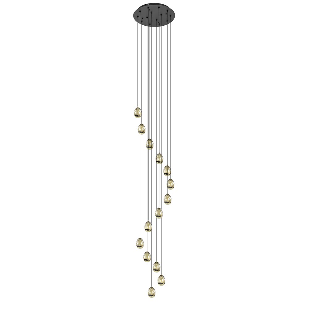 Met deze flinke hanglamp maakt u een mooi statement in uw vide. De 14-lichts hanglamp heeft een hoogte van 350 cm en wordt met een grote plafondplaat van 50 cm opgehangen. De videlamp bestaat uit 14 kappen die deels van massief amber glas en deels van metaal zijn dat is uitgevoerd in glanzend goud. Dit geeft de kap een luxe uitstraling. Het glas is voorzien van belletjes wat een mooi effect geeft wanneer de lamp wordt ingeschakeld. De verlichting geeft direct licht naar beneden dmv de spot onderop het ei, en daarnaast ook indirect licht door het licht binnenin het ei. De videlamp wordt in spiraalvorm opgehangen en is in hoogte in te korten dmv de trekontlasters. Deze videlamp amber glas met zwart is mooi te combineren in diverse woonstijlen. De 14-lichts hanglamp is dimbaar middels een externe dimmer (exclusief).