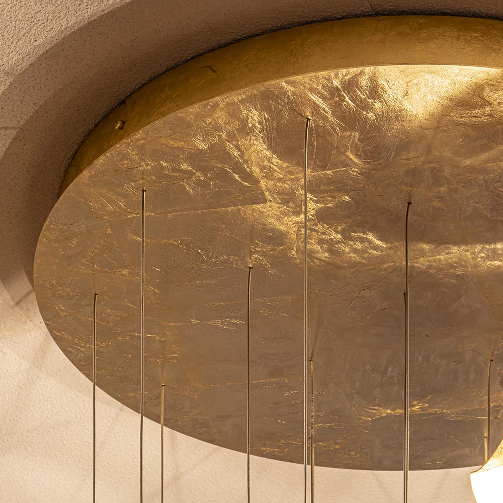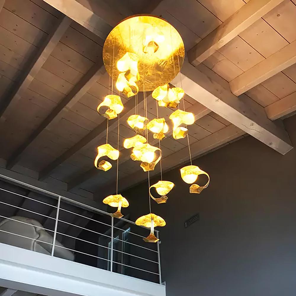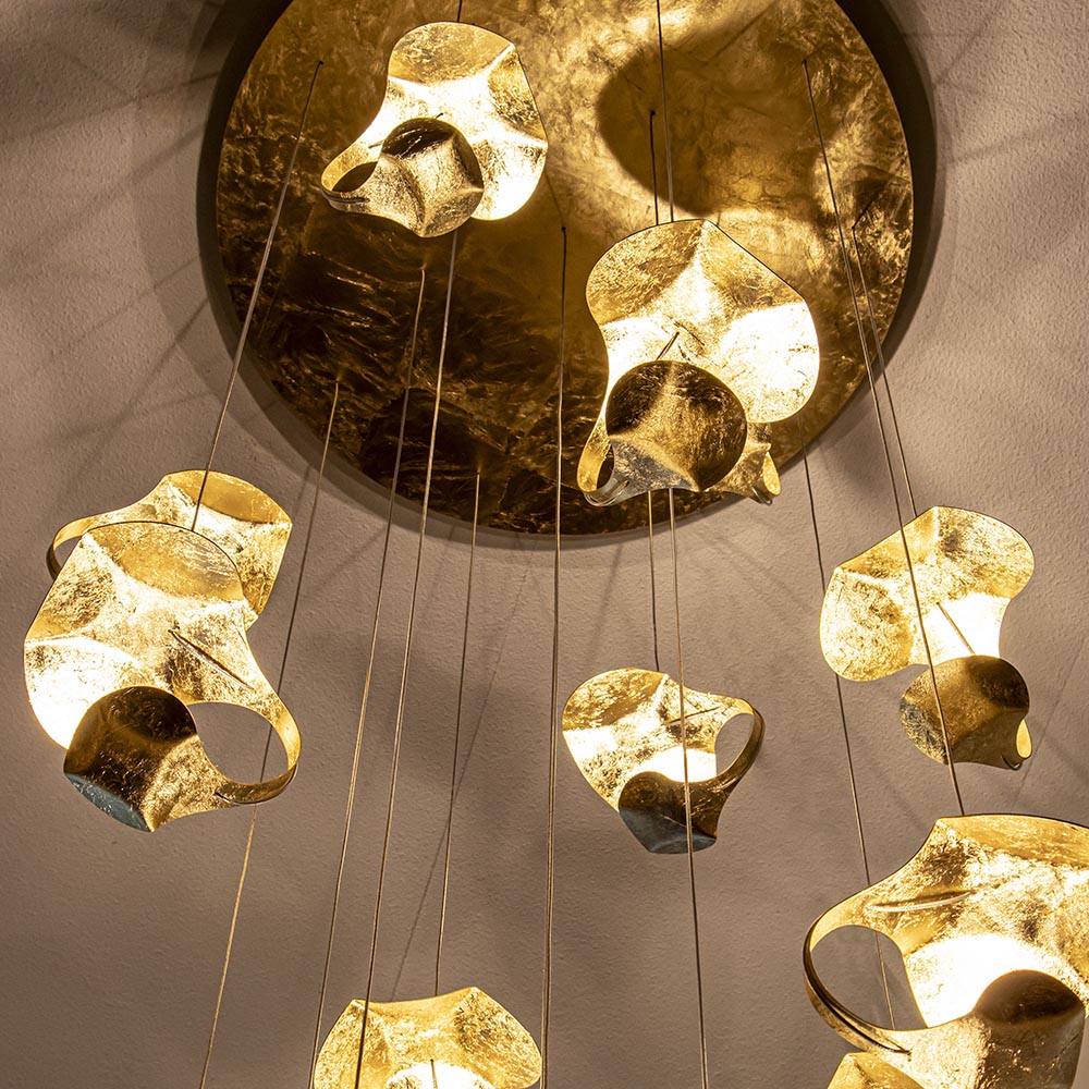 Een prachtige design videlamp van Italiaanse komaf. Deze 16-lichts hanglamp is een ware eyecatcher in uw woning. De designlamp wordt met een grote plafondplaat van 70 cm doorsnede bevestigd. Over de plaat zijn 16 snoeren verdeeld die naar wens op hoogte zijn te hangen. De kappen hebben een organische vorm wat samen een speels geheel maakt. De plaat en de kappen zijn gemaakt van metaal en voorzien van een goldleaf coating. Dit geeft de lamp een chique en luxe uitstraling die mooi past in diverse woonstijlen. De 16 kappen zijn voorzien van LED verlichting en geven een indirecte verspreiding. Met 850 lumen per kap zorgt de lamp voor voldoende licht. De LED designlamp is dimbaar middels de juiste dimmer (exclusief).