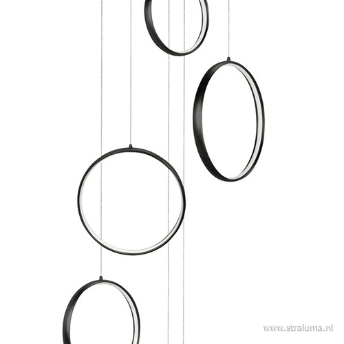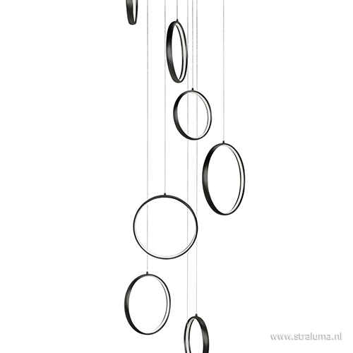 Een moderne hanglamp met een open design. De videlamp is voorzien van 8 ‘kappen’ in de vorm van ringen die ervoor zorgen dat de ruimte waar de hanglamp hangt een goede doorkijk behoudt. Door de maximale hoogte van maar liefst 3,30 meter is de lamp mooi geschikt voor een vide. De hanglamp is voorzien van LED verlichting wat mooi zit weggewerkt in de binnenzijde van de ringen. De mat zwarte ringen zijn ieder op gewenste hoogte te hangen en de lamp wordt aan het plafond bevestigd met een grote ronde zwarte plafondplaat.