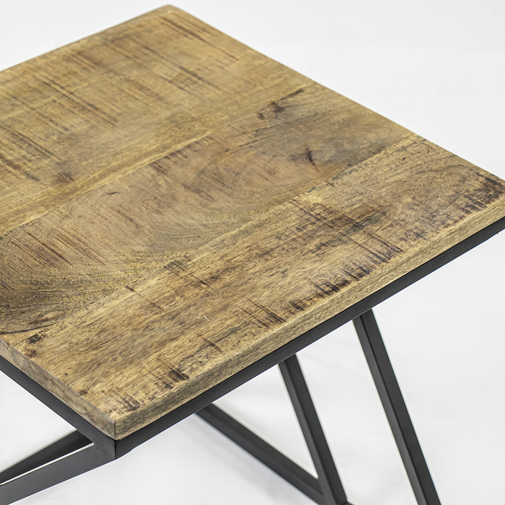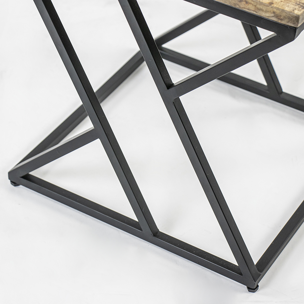 Artistieke bijzettafel met een mango houten blad en een mat zwart metalen frame. Het hout is behandeld en beschermd. Het stoere frame van de bijzettafel maakt de tafel een echter eyecatcher. Het is af te nemen met een vochtig doekje.