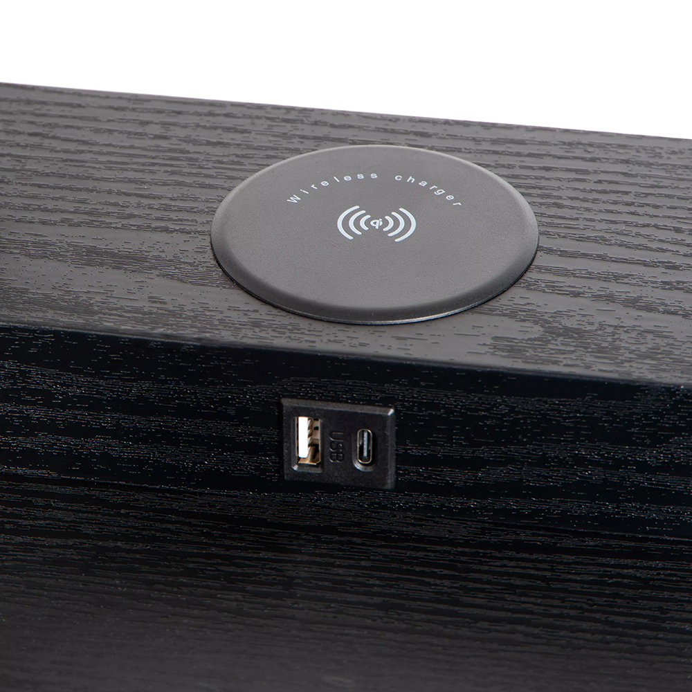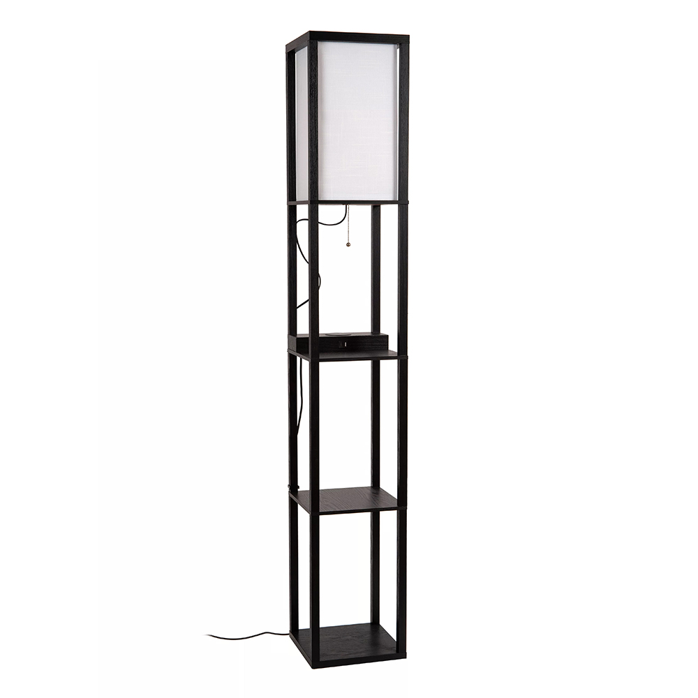 Deze sfeervolle vloerlamp is gemaakt van hoogwaardig mdf en uitgevoerd in het mat zwart. Dit is mooi gecombineerd met een beige kantoenen kap die zorgt voor diffuus licht in de ruimte. Leuke eigenschap van deze vloerlamp is het oplaadplatform op het bovenste plankje. Deze is voorzien van USB aansluitingen en een draadloze oplader. Ideaal voor in de woonkamer of slaapkamer. De overige plankjes zijn prima geschikt om wat leuke accessoires, plantjes of boeken op neer te zetten. De zwarte vloerlamp met kap is voorzien van een snoer met een lengte van 180 cm en wordt gemakkelijk aan en uit geschakeld dmv de nostalgische trekschakelaar onder de kap.