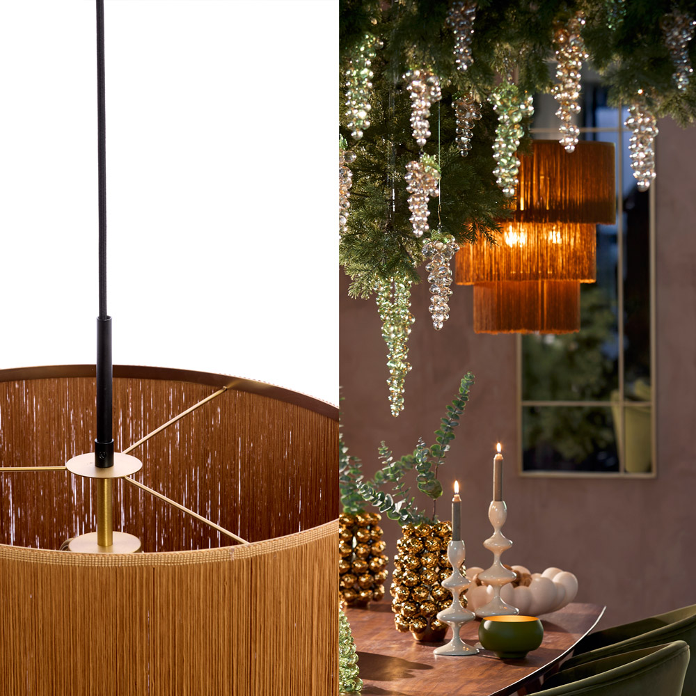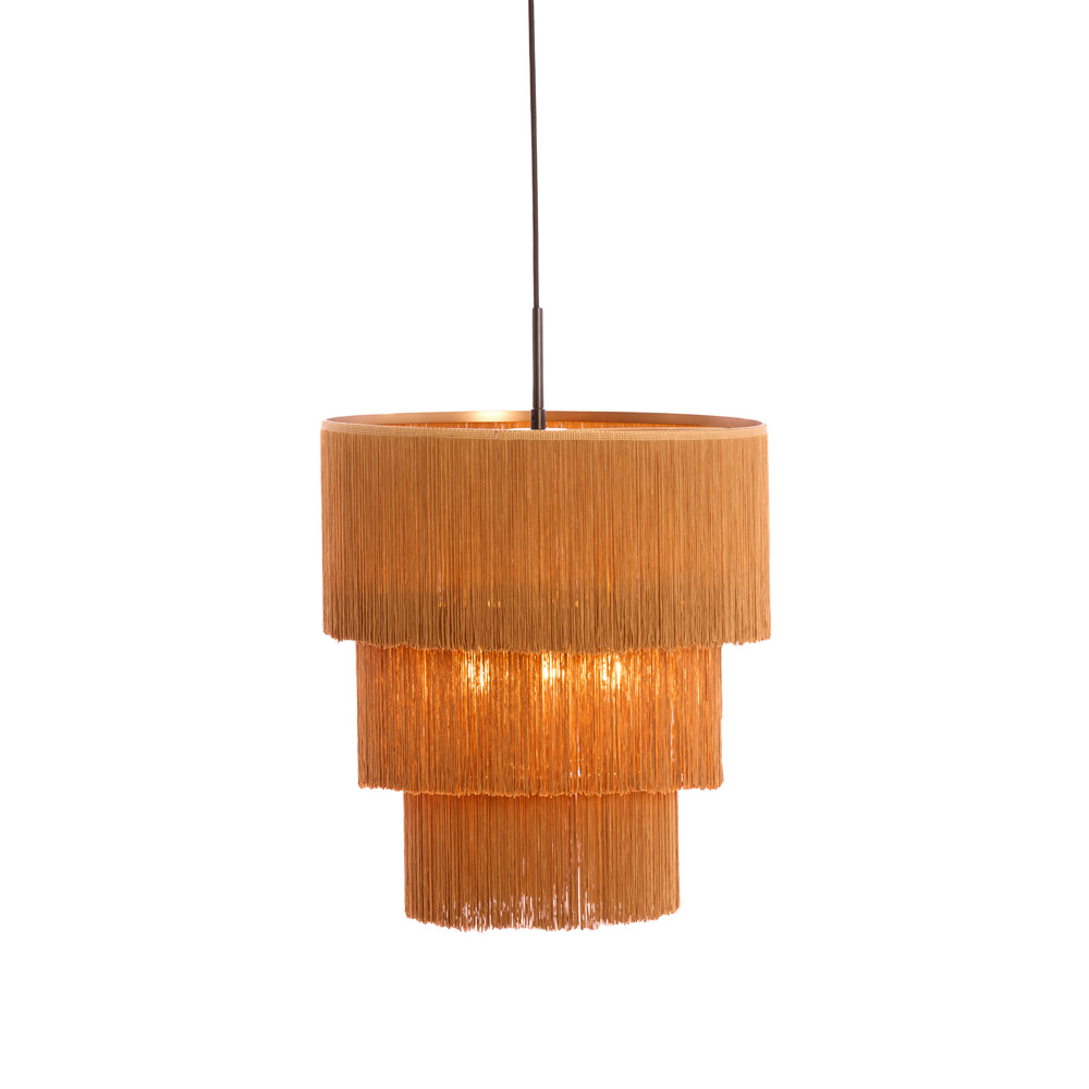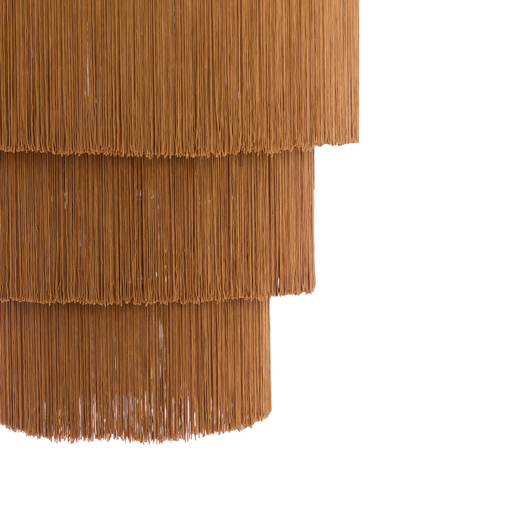 • Opvallend design met speelse franjes voor een warme, sfeervolle uitstraling • 3 lichtpunten zorgen voor een rijk en gelijkmatig lichtbeeld • Warme bruine kleur voor een zachte, natuurlijke look • Perfect boven een ronde eettafel van 120–140 cm of in een gezellige zithoek • E27 fitting – kies zelf de gewenste lichtbron en lichtkleur